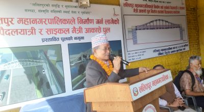 ललितपुर। ललितपुर महानगरपालिकाको सुन्दरीघाट मार्गबाट चक्रपथमा साइकलबाटै वारपार गर्न मिल्ने आकाशेपुल निर्माण हुने भएको छ । महानगर प्रमुख चिरीबाबु महर्जनले