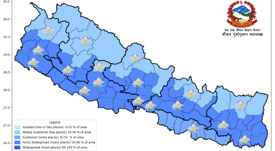 काठमाडौँ । हाल देशभर मनसुनी वायुको प्रभाव रहेको तथा मनसुनको न्यून चापीय रेखा सरदर स्थानको आसपास रहेको जल तथा मौसम