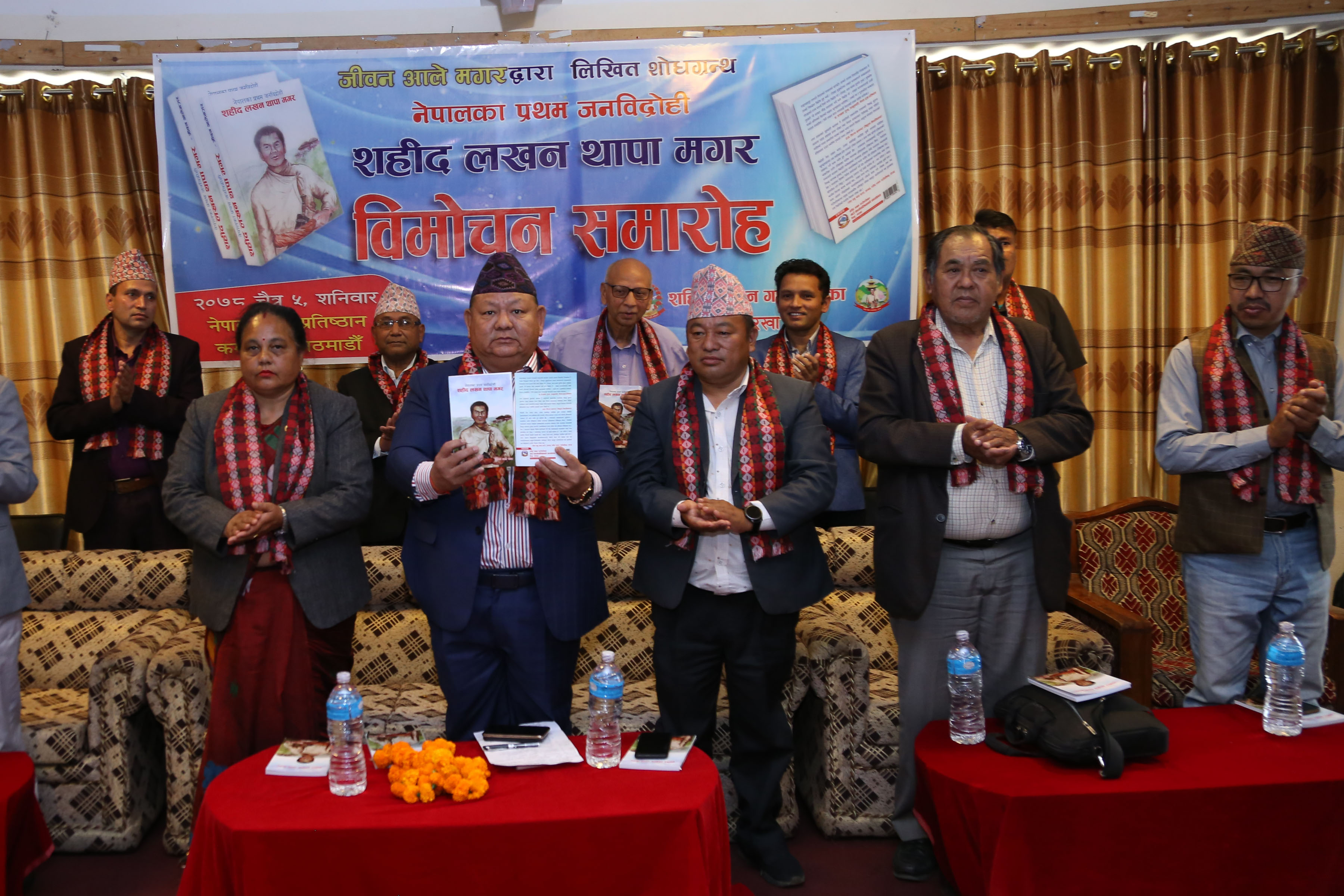 काठमाडौं । लेखक तथा खोजकर्ता जीवन आले मगरद्वारा लिखित शोधग्रन्थ नेपालका ‘प्रथम जनविद्रोही शहिद लखन थापा मगर’ नामक पुस्तक विमोचन गरिएको छ । राजधानीको प्रज्ञा भवनमा आज आयोजित एक समारोह शहिद लखन गाउँपालिका गोरखाले प्रकाशन गरेको उक्त शोधग्रन्थ नेपाल सरकारका माननीय संस्कृति, पर्यटन, तथा नागरिक उड्डयनमन्त्री प्रेमवहादुर आलेले विमोचन गर्नुभयो ।