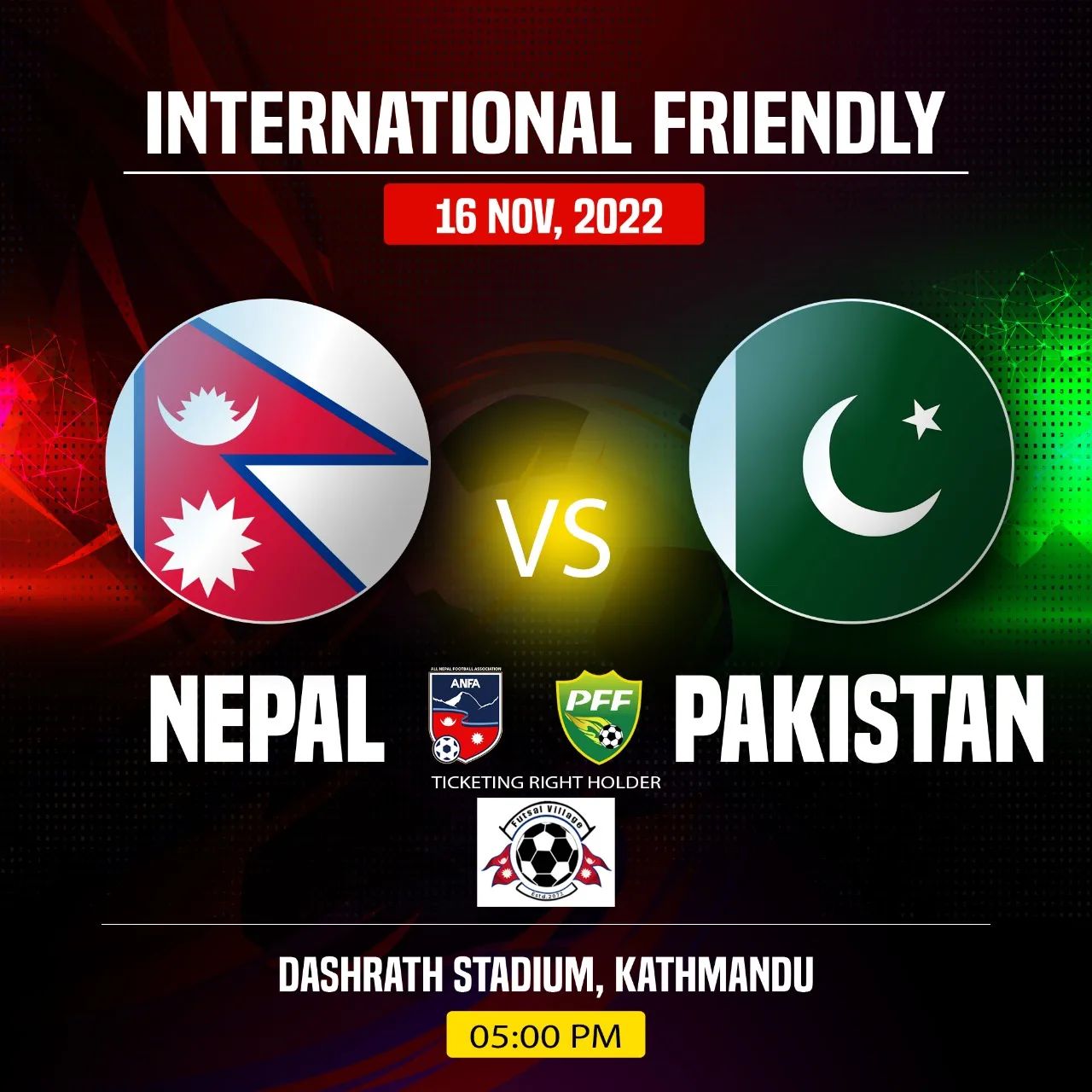 साँझ ५ः०० बजे सुरु हुने उक्त खेललाई एन्फाले सामान्य प्यारापिटतर्फ ५ सय र भिआइपीतर्फ १ हजारको टिकट दर निर्धारण गरिएको जनाएको छ ।