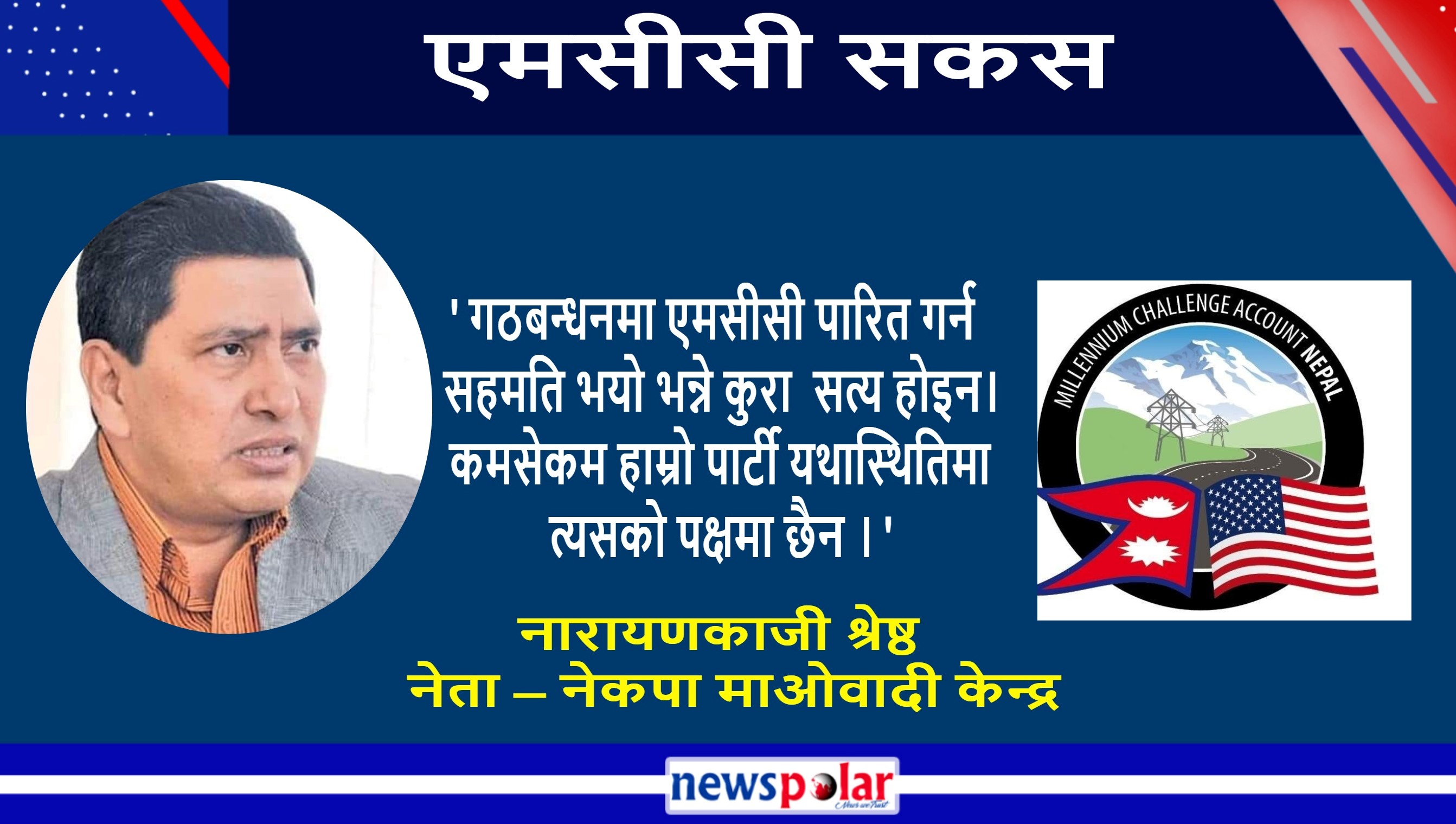 काठमाडौँ । नेकपा माओवादी केन्द्रका नेता नारायणकाजी श्रेष्ठले अहिलेसम्म सतारुढ गठबन्धनमा एमसीसी पारित गर्ने भन्नेबारेमा कुनै सहमति नभएको बताउनुभएको छ । उहाँले एमसीसी पारित नभए सत्ता गठबन्धन तोडिन्छ भन्ने प्रधानमन्त्री शेरबहादुर देउवाको भनाइमा कुनै सत्यता नभएको बताउनुभयो ।