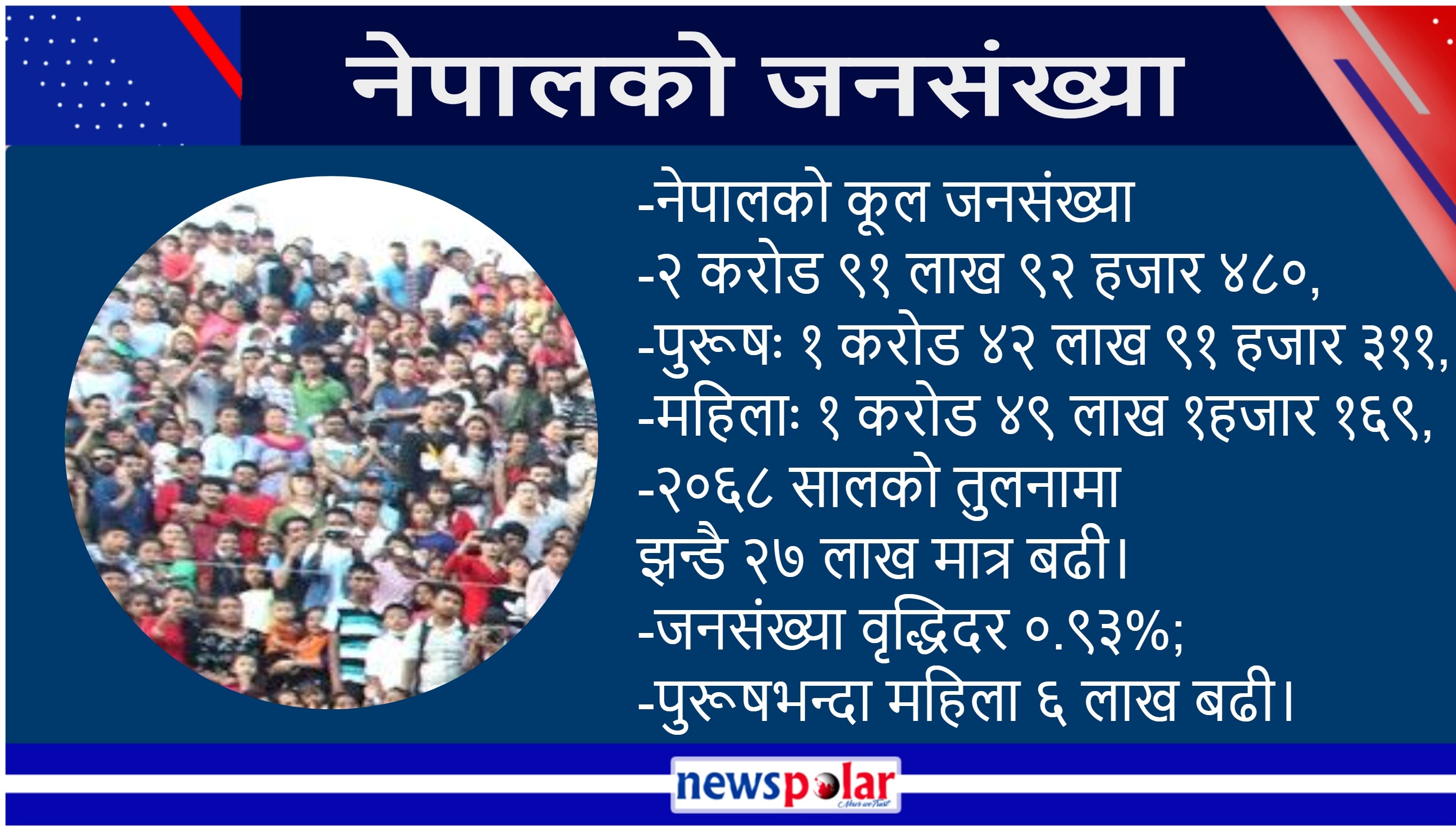 कूल जनसङ्ख्या अघिल्लो गणनाको तुलनामा २६ लाख ९७ हजार ९७६ ले बढी हो । यसरी हेर्दा दश वर्षमा नेपालको जनसङ्ख्या १०.१८५ ले बढेको देखिएको छ । विगत दश वर्षको सरदर वार्षिक वृद्धिदर ०.९३५ रहेको र जुन अघिल्लो जनगणनामा १.३५५ रहेको विभागले जनाइको छ । यस जनगणनामा पहिलो चरणको स्थलगत कार्य विसं २०७८ भदौ ३० देखि असोज १८ गतेसम्म र दोस्रो चरणको स्थलगत कार्य विसं २०७८ कात्तिक २५ देखि २०७८ मङ्सिर ९ गतेसम्म सम्पन्न भएको थियो ।