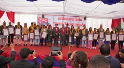 कमला पुल निर्माणका लागि चन्दा सङ्कलन अभियान सुरु नास्टद्वारा १३ विधामा २० जना वैज्ञानिक, प्राविधिज्ञ एवं संस्थाहरु पुरस्कृत महिला भलिबलः एपिएफ फाइनल प्रदेश प्रधानमन्त्री कार्कीद्वारा बर्दिया घटनाबारे अध्ययन गर्न गृहमन्त्रीलाई निर्देशन चालिसेमा भएको दुर्घटनामा ३५ जना घाइते काठमाडौँ उपत्यकाका नदीलाई सफा राख्न सरकारले आवश्यक काम गरिरहेको छः मन्त्री घिसिङ अन्तिम समयमा गोल खाँदा आर्सनल एस्टन भिल्लासँग पराजित कार्यविधिमा मुक्तकमलरीसम्बन्धी छुटेका विषय सम्बोधन गर्नेछौँँ: मुख्यमन्त्री शाह पोखरालाई गुल्जार बनाउने ‘पोखरा सडक महोत्सव’ प्रथम राष्ट्रिय इनलाइन स्केट म्याराथनको उपाधि निमिषा र साम्देन लाई
