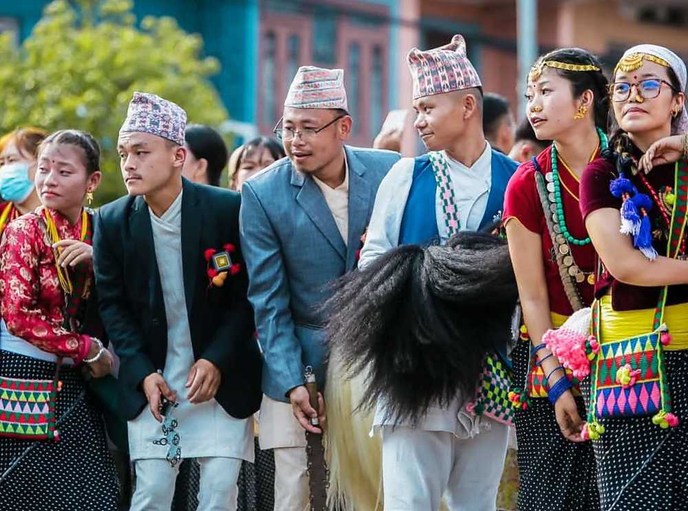 दौरा सुरुवाल र टोपीमा सजिएका युवा र गुन्युचोली, लाछा, सिरबन्दी, चेप्टे सुन, पैसाको हारी माला, नौगेडीजस्ता गहनामा सजिएका युवतीहरू हातमा ढोल, झ्याम्टा र चम्मर बोकेर गीतमा लय मिलाउँदै नाच्न व्यस्त छन् । छातीमा पेचुरी धजुरी, वाबु, बुन्छत र मुर्चुङ्गा झुन्ड्याएका युवायुवती ढोल झ्याम्टाको तालमा विभिन्न चरा चुरुङ्गी र जीवजनावारको हाउभाउ गर्दै नाचिरहेका छन् ।