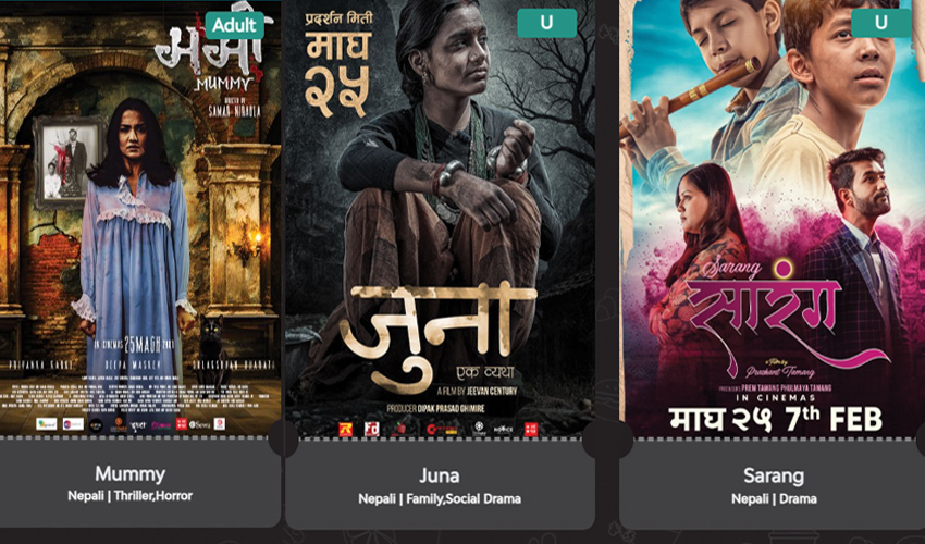 काठमाडौँ । आजदेखि एकसाथ तीन चलचित्रको प्रदर्शन सुरु भएको छ । मङ्सिर र पुसमा निकै कम सङ्ख्यामा चलचित्र प्रदर्शन भए पनि माघको अन्तिम सातादेखि आउँदो केही महिना हरेक हप्ता दुईदेखि तीन चलचित्र प्रदर्शन हुने घोषणा गरिएको छ । यसै क्रममा आजदेखि ‘मम्मी’, ‘जुना’ र ‘सारङ्ग’ को प्रदर्शन सुरु भएको छ ।