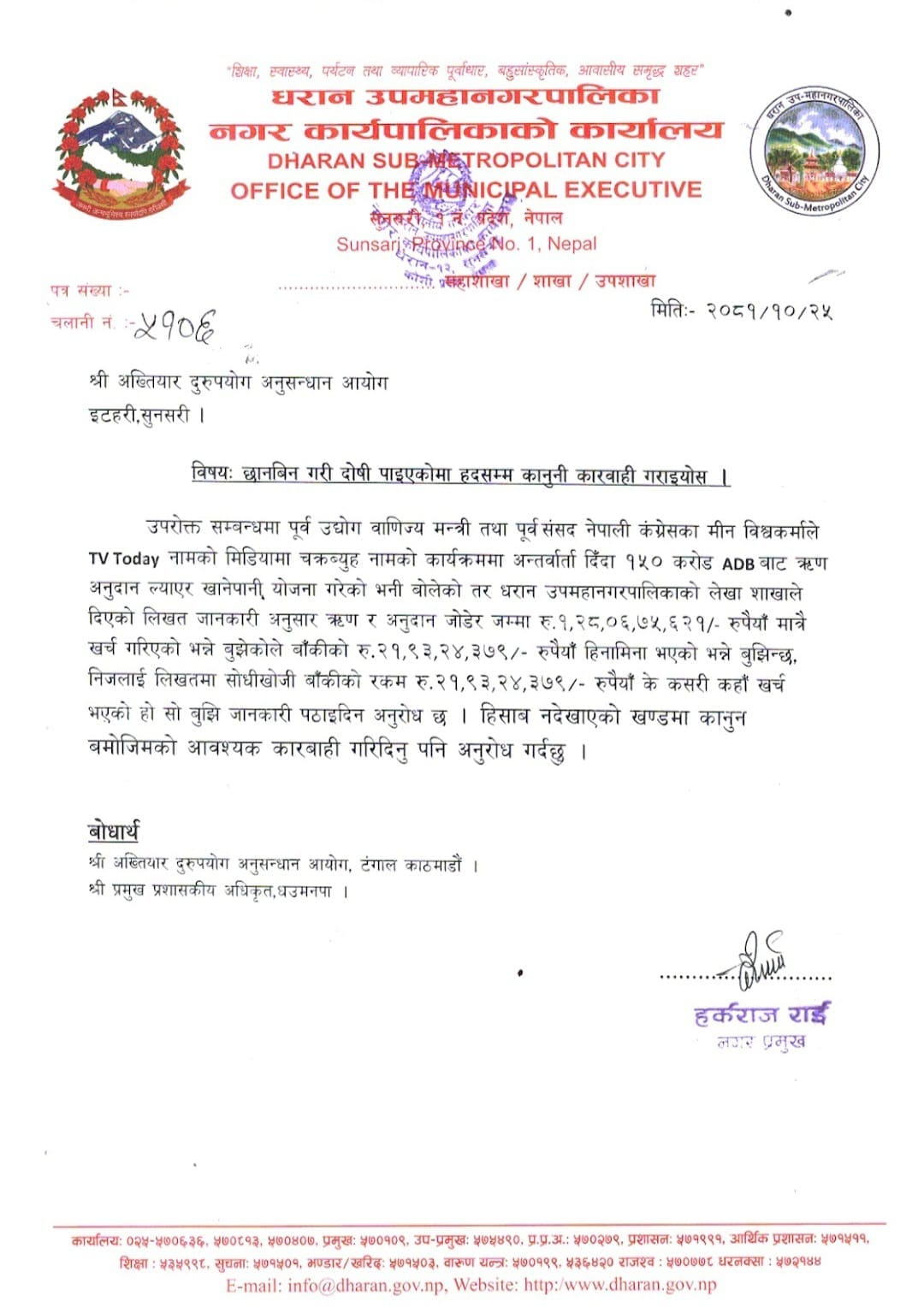 काठमाडौँ। नेपाली कांग्रेसका प्रचार विभाग प्रमुखसमेत रहेका केन्द्रीय सदस्य मीनबहादुर विश्वकर्मालाई धरान उपमहानगरपालिकाका मेयर हर्क साम्पाङले अख्तियार दुरूपयोग अनुसन्धान आयोगमा उजुरी दिएका छन्।