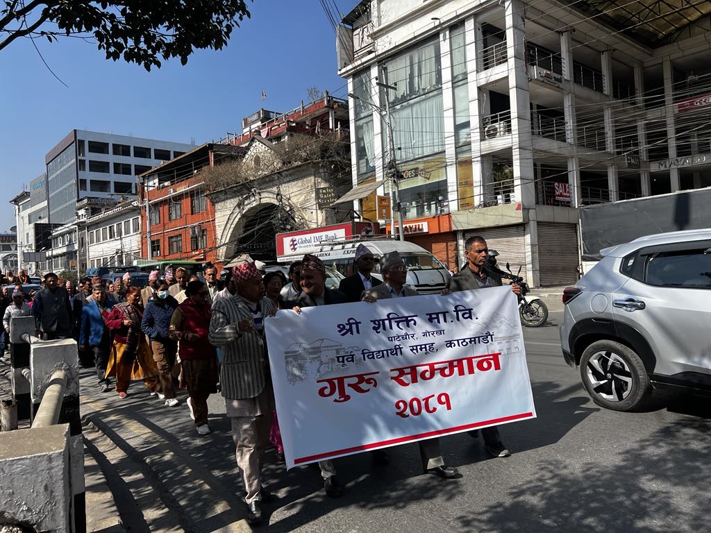 ऐतिहासिक दरबार हाइस्कूलबाट गोरखाली चेलीहरुले पञ्चेबाजा बजाउँदै साजसज्जासहितको विशेष मोटरमा राखेर तीन प्रधानाध्यपकलाई नगरपरिक्रमा गराउँदै प्रज्ञा भवनको सिद्धिचरण सभाकक्षमा अभिनन्दन गरिएको थियो । कार्यक्रम संयोजक तथा श्री शक्ति एलुम्नाई एशोसिएसनका निवर्तमान संयोजक मेघबहादुर मास्केले गौरवपूर्ण इतिहास बोकेको विद्यालय र गुरुहरुको योगदानको उच्च कदर गर्दै नयाँ संस्कार सुरु गरिएको बताउनुभयो ।