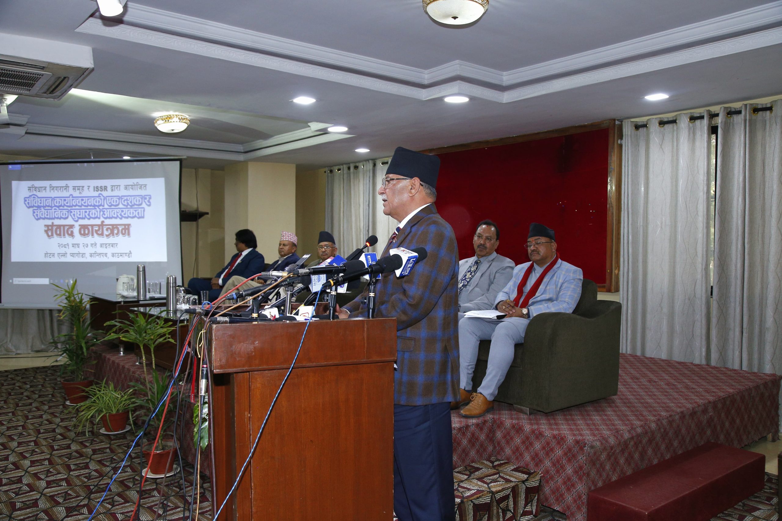 संविधान निगरानी समूह र ‘इन्स्टिच्युट फर स्ट्राटेजिक एन्ड सोसियो–इकोनोमिक रिसर्च (आईएसएसआर)’ द्वारा आयोजित ‘संविधान कार्यान्वयनको एक दशक र संवैधानिक सुरको आवश्यकता’ विषयक संवाद कार्यक्रममा अध्यक्ष दाहालले दक्षिणपन्थी कोणबाट संविधानको तीव्र विरोध भइरहेको अवस्थामा जतिसुकै आलोचना र प्रतिआलोचना भए पनि शान्ति सम्झौताका पक्षधर मिल्नुपर्ने आवश्यकता औँल्याए।