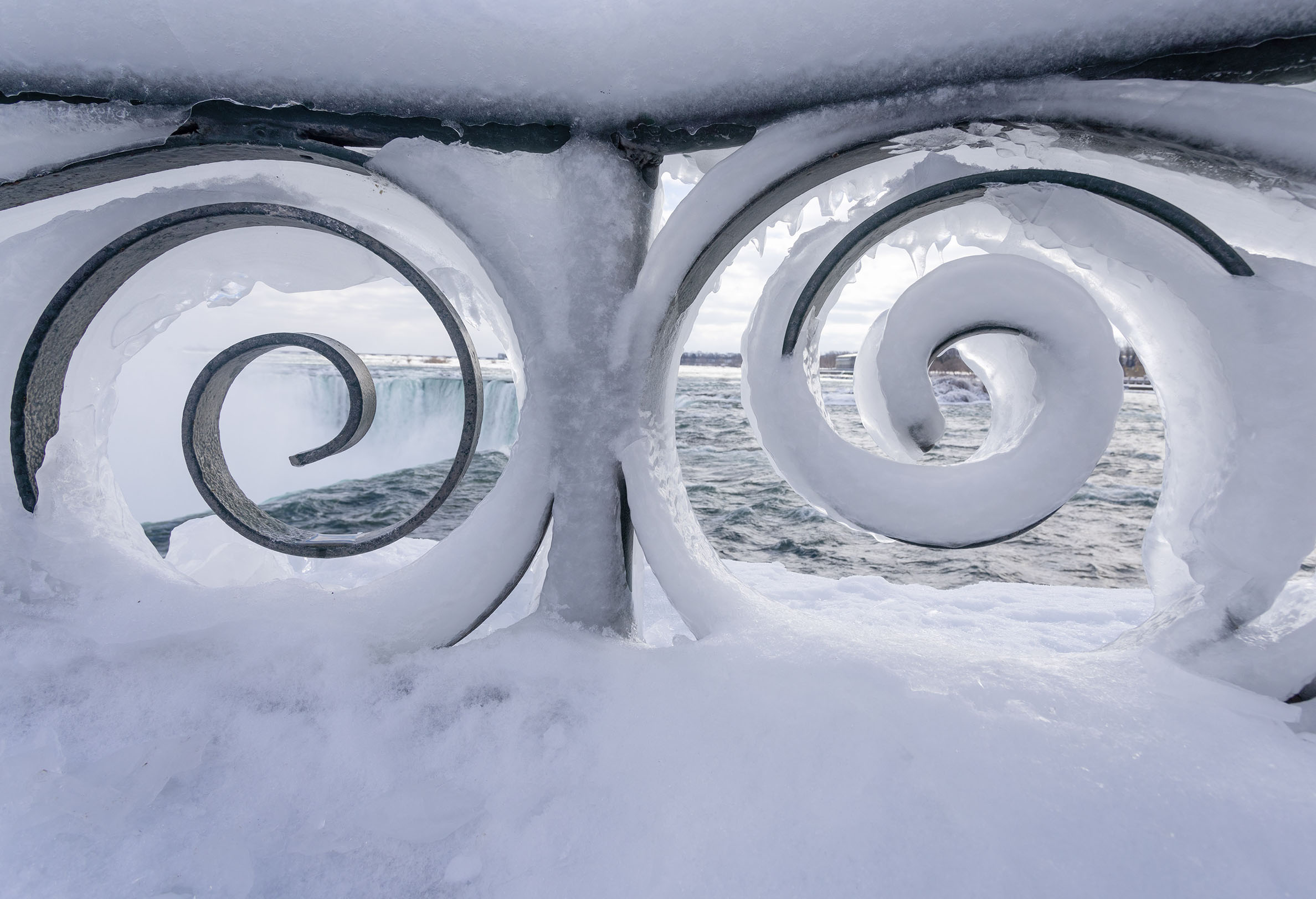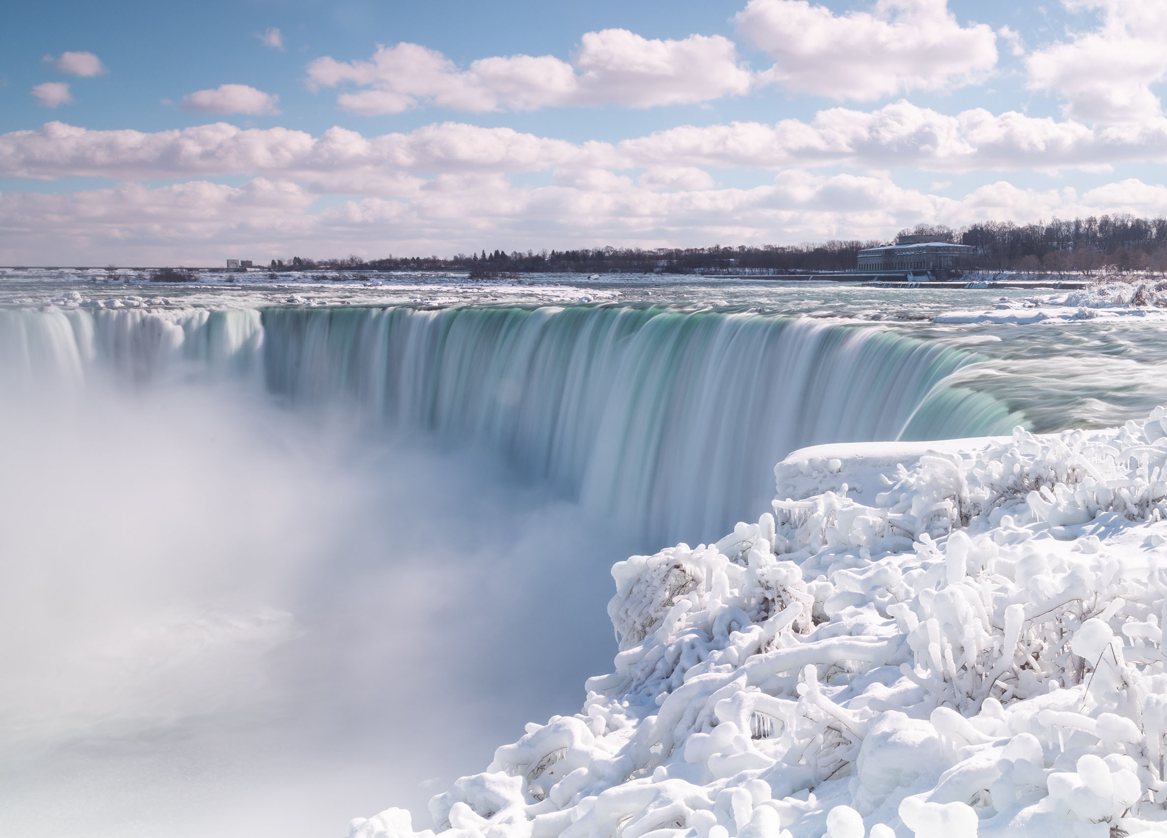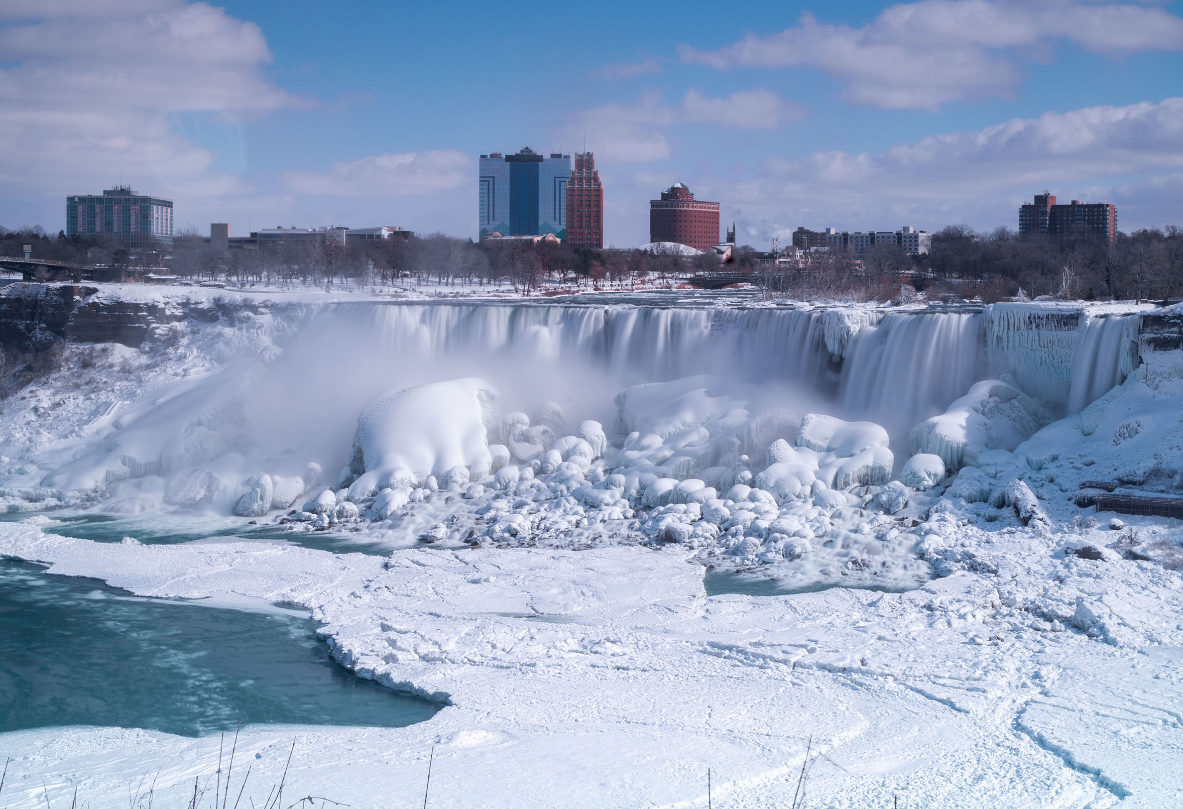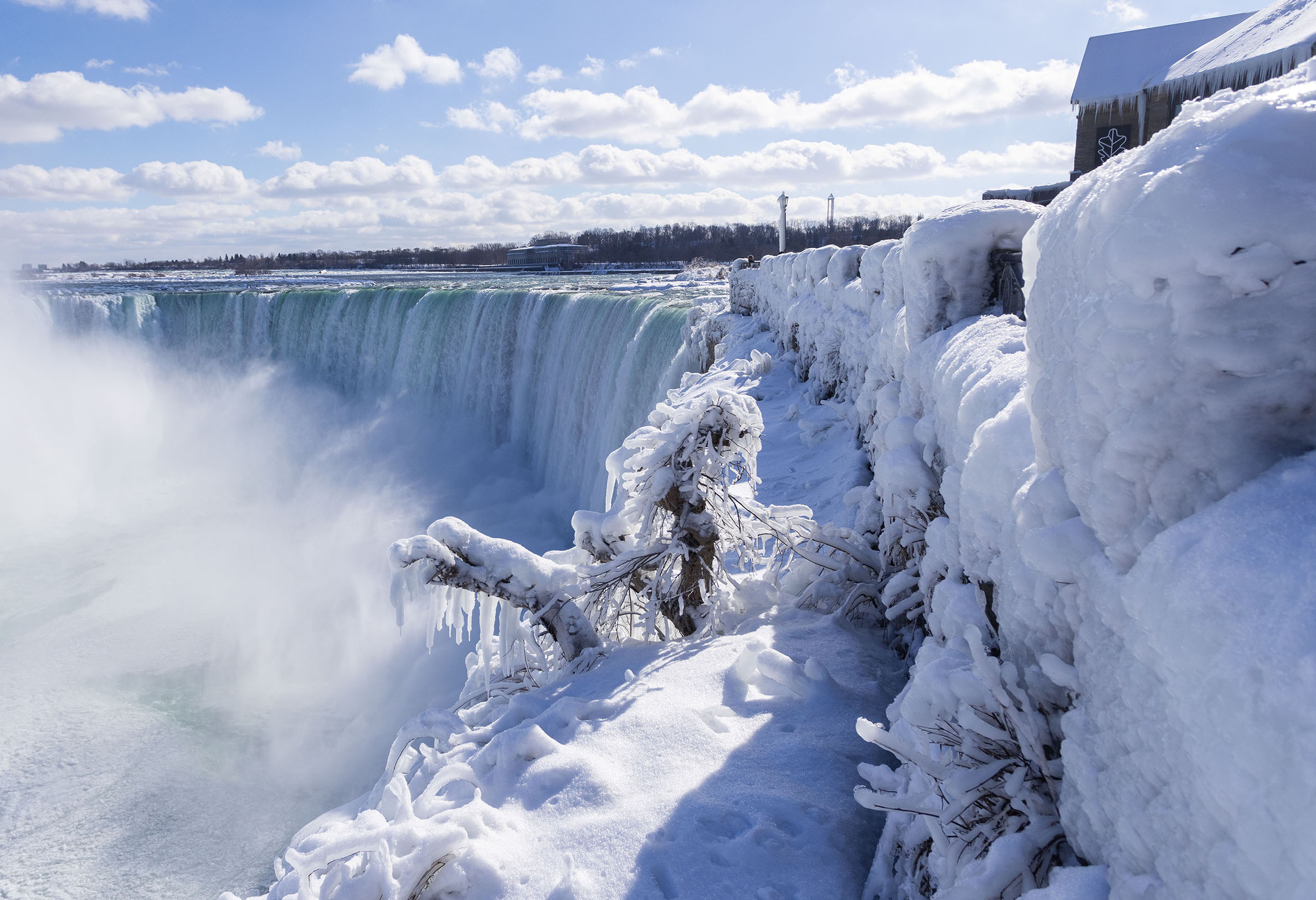 अमेरिकाको उत्तर पूर्वमा रहेको विश्व प्रसिद्ध नायाग्रा फल्सका विभिन्न भाग कम तापक्रमका कारण जमेर हिउँले ढाकिएका छन् ।