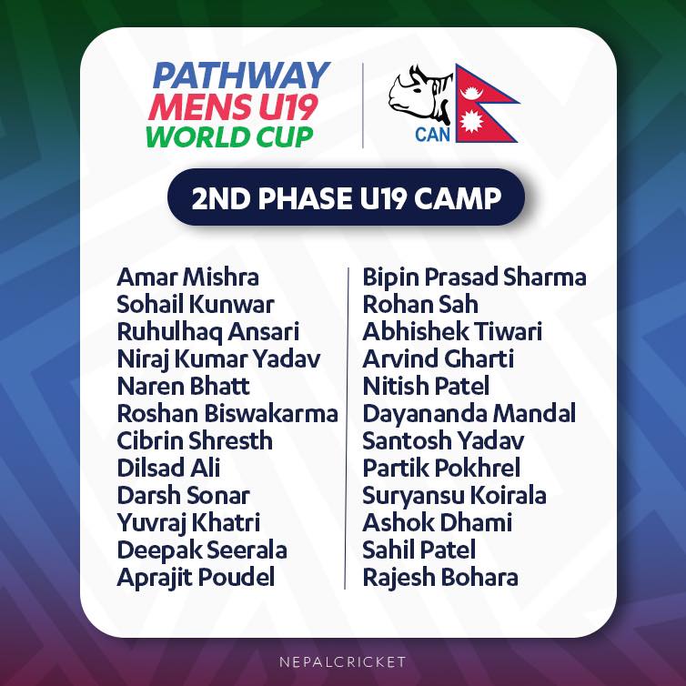 त्यसका लागि क्यानले यू १९ का २४ खेलाडीलाई दोस्रो चरणको क्याम्पका लागि बोलाएको छ । आगामी चैतमा नेपालले आईसीसी यू १९ विश्वकपको एसिया छनोट आयोजना गर्दैछ। यसअघि पहिलो चरणमा ३६ खेलाडी छनोट गरिएको थियो।