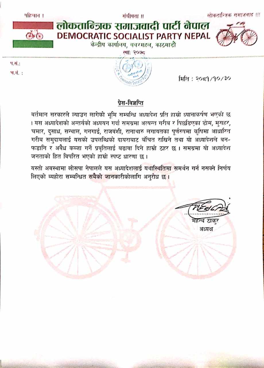 काठमाडौं । लोकतान्त्रिक समाजवादी पार्टी (लोसपा)ले भूमिसम्बन्धी अध्यादेश अस्वीकार गर्ने भएको छ ।