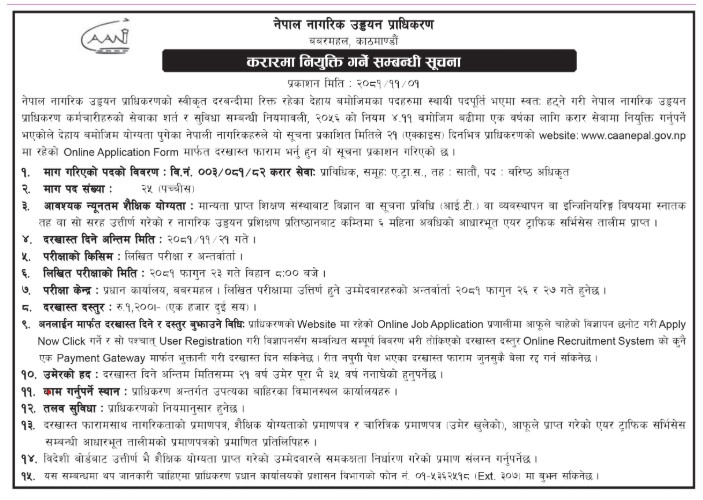 मान्यता प्राप्त शिक्षण संस्थाबाट विज्ञान वा सूचना प्रविधि (आईटी) वा व्यवस्थापन वा इन्जिनियरिङ विषयमा स्नातक तह वा सो सरह उत्तीर्ण गरेका, नागरिक उड्यन प्रशिक्षण प्रतिष्ठानबाट कम्तिमा ६ महिना अवधिको आधारभूत एयर ट्राफिक सर्भिसेज तालिम लिएका २१ वर्ष पूरा भइ ३५ वर्ष ननाघेका नेपाली नागरिकले आवेदन दिन सक्नेछन्।