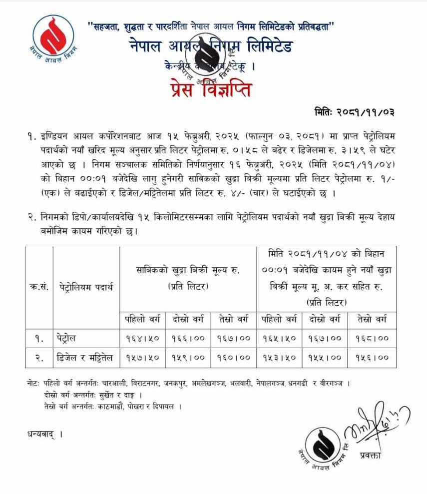 यस्तै डिजेल तथा मट्टितेलको मूल्य घटाएको छ । निगमका अनुसार पेट्रोलको मूल्य प्रतिलिटर १ रुपैयाँ बढेको छ भने डिजेल तथा मट्टितेलको मूल्य ४ रुपैयाँ घटेको छ ।