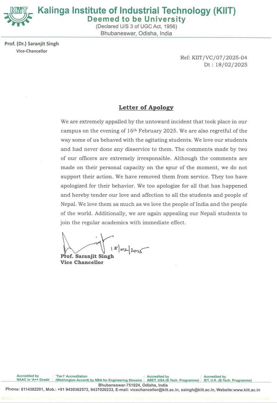 काठमाडौं । नेपाली विद्यार्थी प्रकृति लम्साल मृत्युसम्बन्धी घटनामा भारतको ओडिसास्थित कलिंगा इन्स्टिच्युट अफ इन्डस्ट्रियल टेक्नोलोजी (केआईआईटी)ले माफी मागेको छ ।