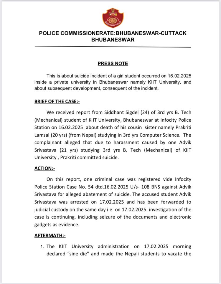 भुवनेश्वर प्रहरी कार्यालयको कमिसनर कार्यालयले विज्ञप्ति जारी गर्दै आरोपी छात्र अद्विक श्रीवास्तवलाई पक्राउ गरी न्यायिक हिरासतमा पठाइएको पनि जानकारी गराएको छ ।