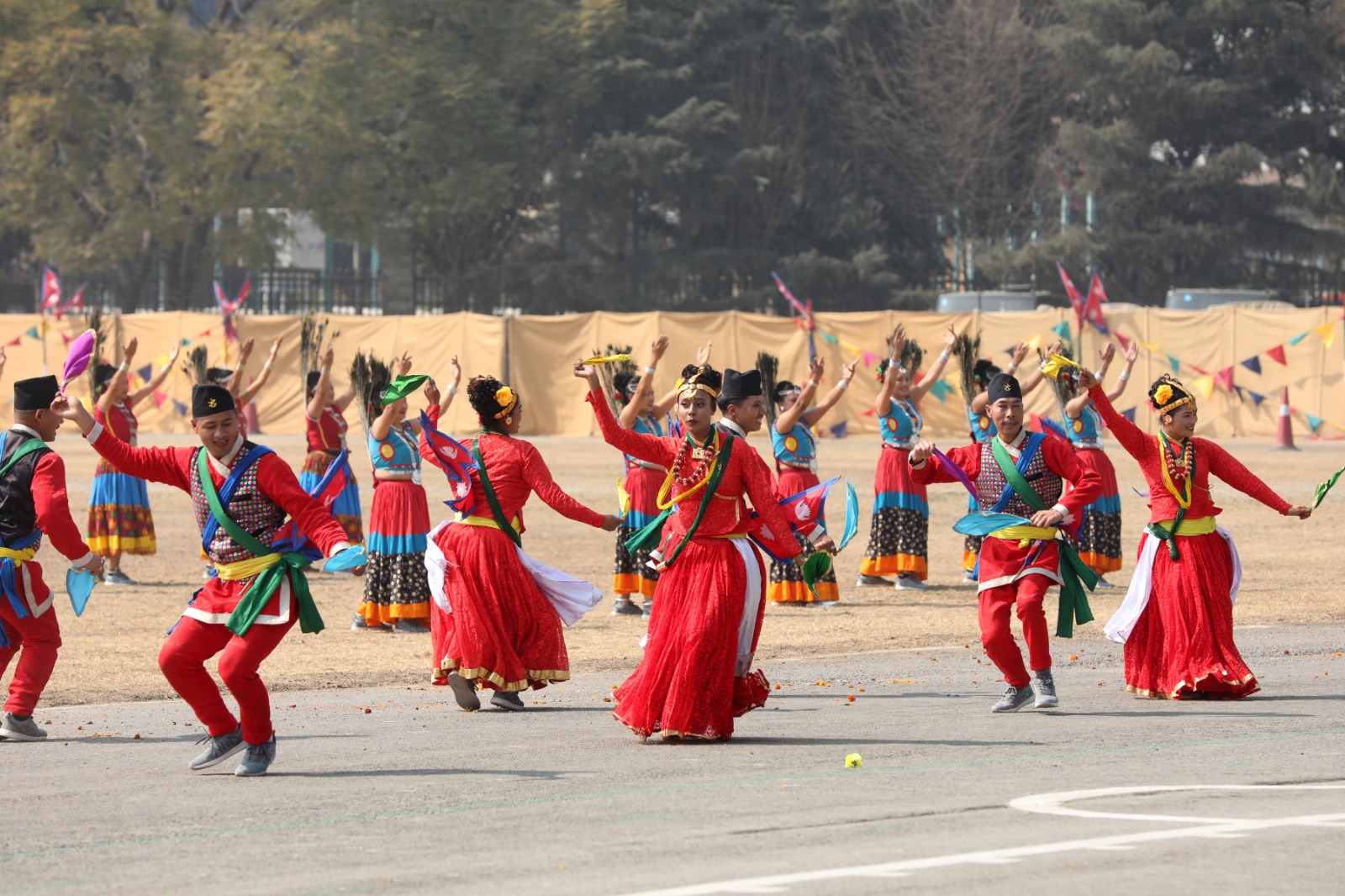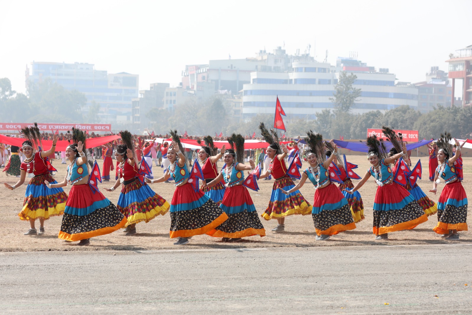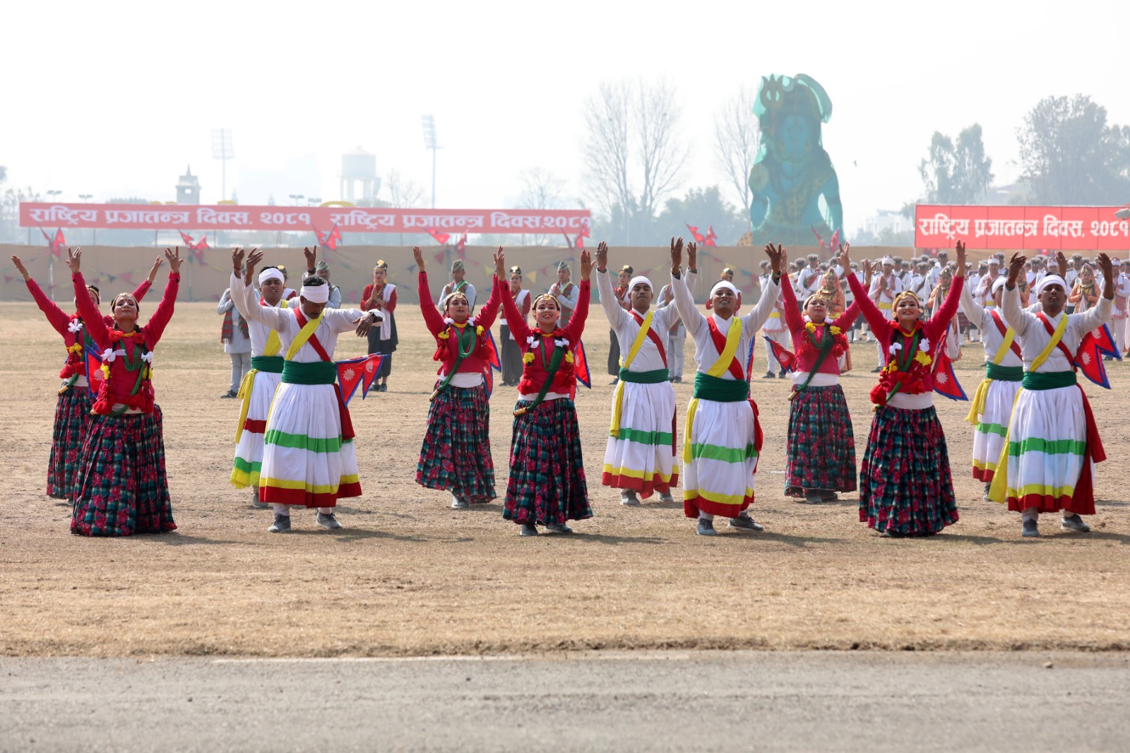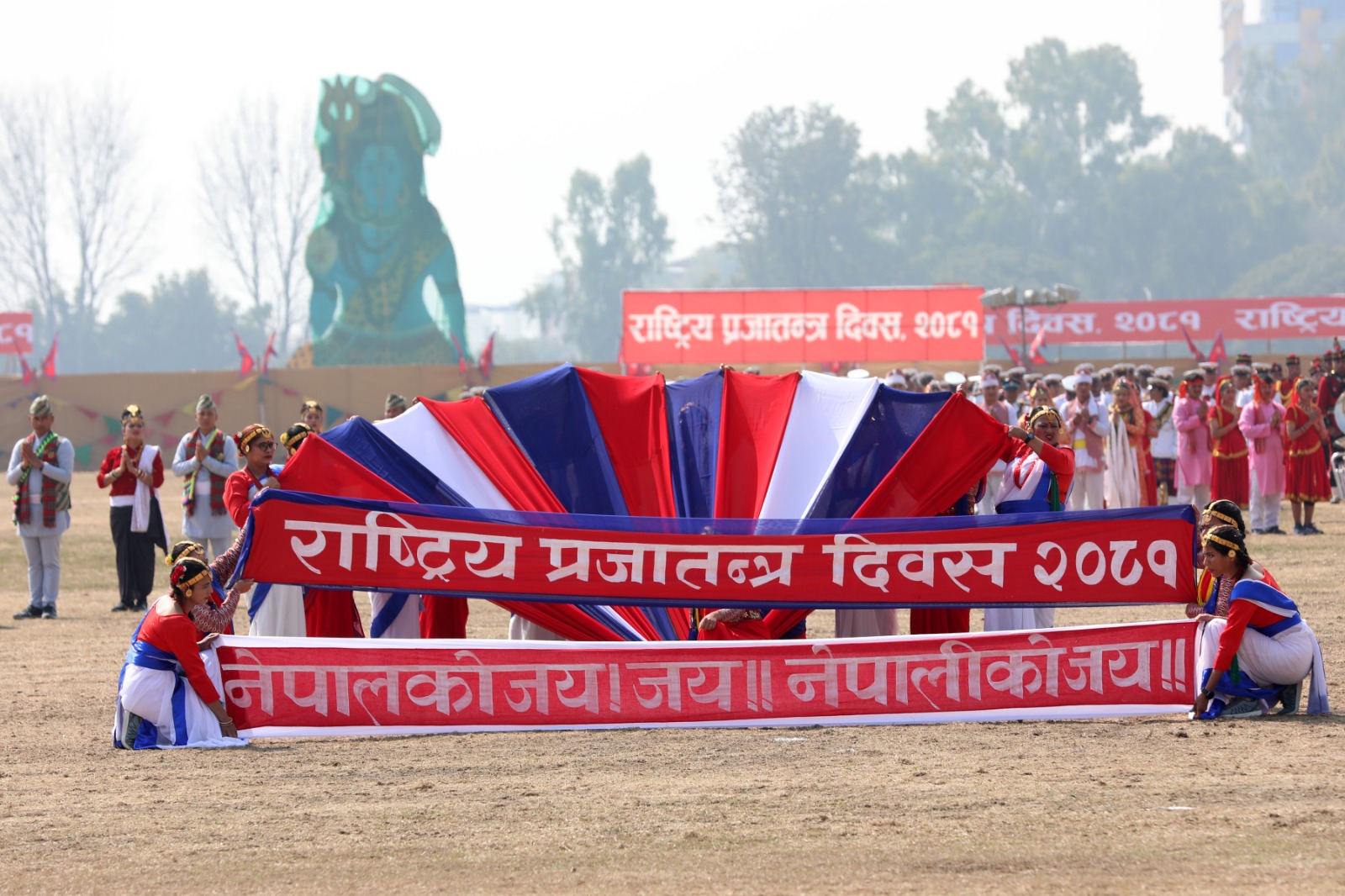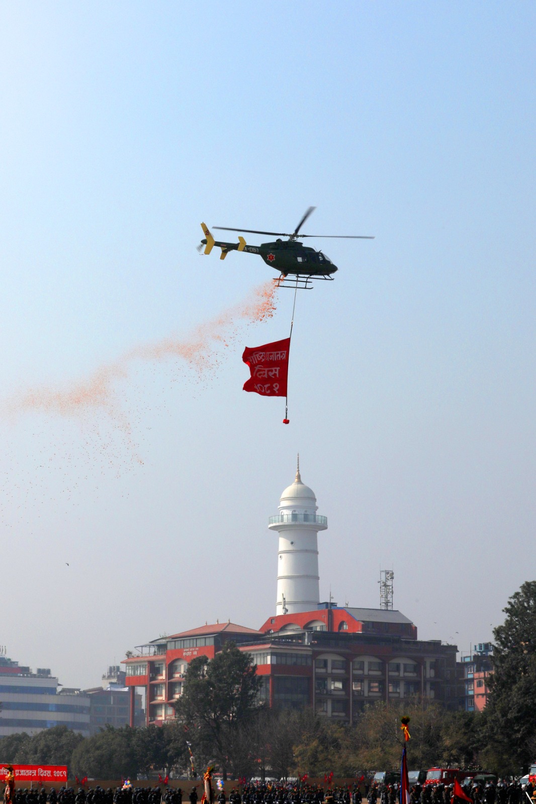 सोही अवसरमा नेपाली सेनाको हेलिकोप्टरबाट राष्ट्रिय प्रजातन्त्र दिवस, २०८१ अङ्कित ब्यानर प्रदर्शन गरी पुष्पवृष्टि एवं रङ्गीचङ्गी बेलुनहरू उडाइएको थियो । समारोहमा नेपाली सेना, नेपाल प्रहरी, सशस्त्र प्रहरी बल नेपाल र नेपाल स्काउटद्वारा ‘मार्चपास’ र ‘ब्याण्ड’ प्रस्तुत गरिएको थियो ।
