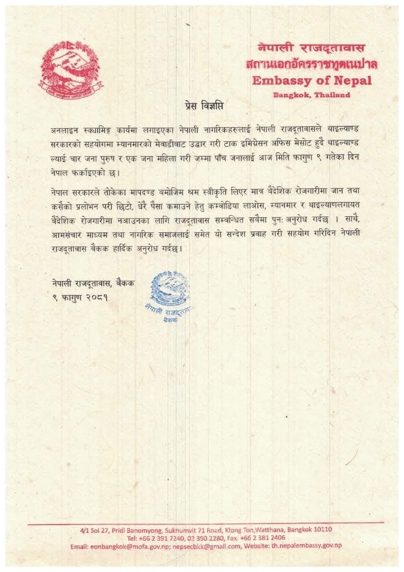 म्यानमारबाट उद्धार गरिएका पाँच नेपालीलाई स्वदेश फर्काइयो