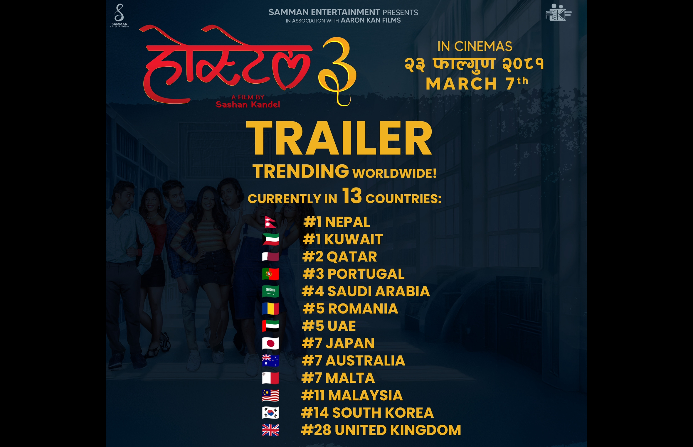 काठमाडौं । यही फागुन २३ गते रिलिज हुने तयारीमा रहेको नेपाली चलचित्र ‘होस्टेल ३’को ट्रेलर सार्वजनिक भएसँगै यसले विभिन्न रेकर्डहरू कायम गर्न थालेको छ । शुक्रवार रिलिज भएको यो ट्रेलरले दर्शकको व्यापक प्रतिक्रियासँगै सार्वजनिक भएको २१ घण्टामा नै युट्युबमा १० लाख भ्युज पुरा गरेको छ भने विश्वका १३ देशमा ट्रेन्डिङमा रहेको छ । १० लाख भ्युज पुग्दासम्म यसले ४२ हजार भन्दा धेरै लाइक्स र ३ हजार ४ सय भन्दा धेरै प्रतिक्रियाहरू प्राप्त गरेको थियो ।