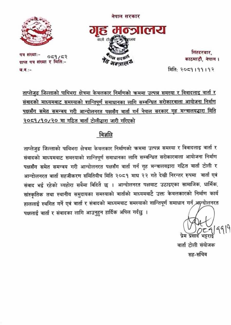 ‘ताप्लेजुङको पाथीभरा क्षेत्रमा केबलकार निर्माणको क्रममा उत्पन्न समस्या र विवादलाई वार्ता र संवादको माध्यमबाट समस्याको शान्तिपूर्ण समाधानमा सरोकारवाला आयोजना निर्माण पक्षसँग समन्वय गरी आन्दोलनरत पक्षसँग निरन्तर संवाद भइरहेको छ ।’ वार्ता टोली संयोजक प्रेमप्रसाद भट्टराईद्वारा जारी विज्ञप्तीमा भनिएको छ ।