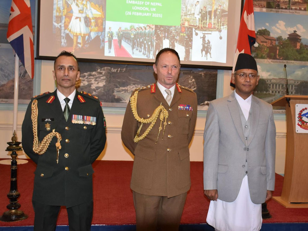 कार्यक्रमलाई सम्बोधन गर्दै बेलायतका लागि नेपाली राजदूत डा.चन्द्रकुमार घिमिरेले नेपाली सेनाको गौरवशाली इतिहास र दिगो विरासतको स्मरण गरे। उनले नेपालको सार्वभौमसत्ता, भौगोलिक अखण्डता र राष्ट्रिय हितको संरक्षण र प्रवर्द्धनमा नेपाली सेनाको योगदान उल्लेखनीय रहेको बताए।