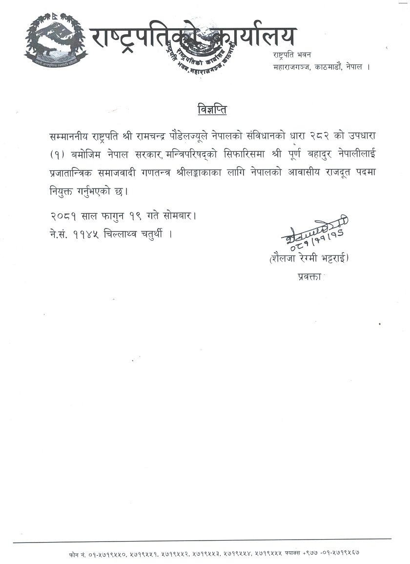 सोमबार राष्ट्रपति पौडेलले नेपालीलाई श्रीलंकाका लागि नेपालको आवासीय राजदूत पदमा नियुक्त गर्नुभएको हो ।