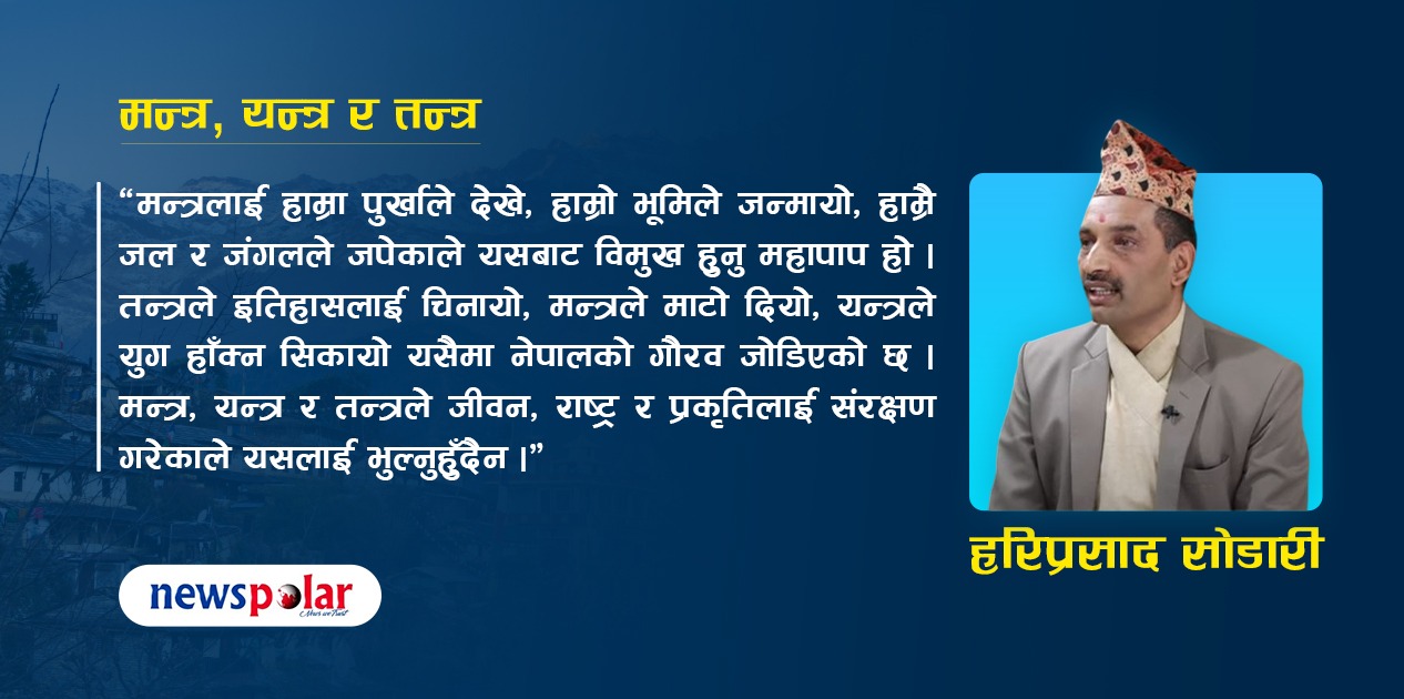 नेपाल यसरी मन्त्रकी जननी, तन्त्रकी मातृभूमि, औषधिकी आमा, योगको नर्सरी, मुद्राकी माँ, यन्त्रको उत्पत्तिस्थल भयो । मन्त्रले ऋषि जन्माउँछ, यन्त्रले विज्ञान मौलाउँछ, तपले ज्ञानलाई फुलाउँछ, साधनाले शान्तिलाई फैलाउँछ, तन्त्रले रोगलाई हटाउँछ, संस्कारले समस्याको समाधान गर्छ । मन्त्र अदृश्य शक्ति, अचूक हतियार, उपाय र उपचारको स्रोत हो । ध्वनिले जन्माएको, अक्षरले बनाएको, शब्दले निर्माण गरेको, वाक्यले बाँधिएको, अर्थले भरिएको अद्भूत र अविनाशी शक्ति भएको ईश्वरको श्वास तथा हाम्रो विरासतलाई मन्त्र भनियो ।