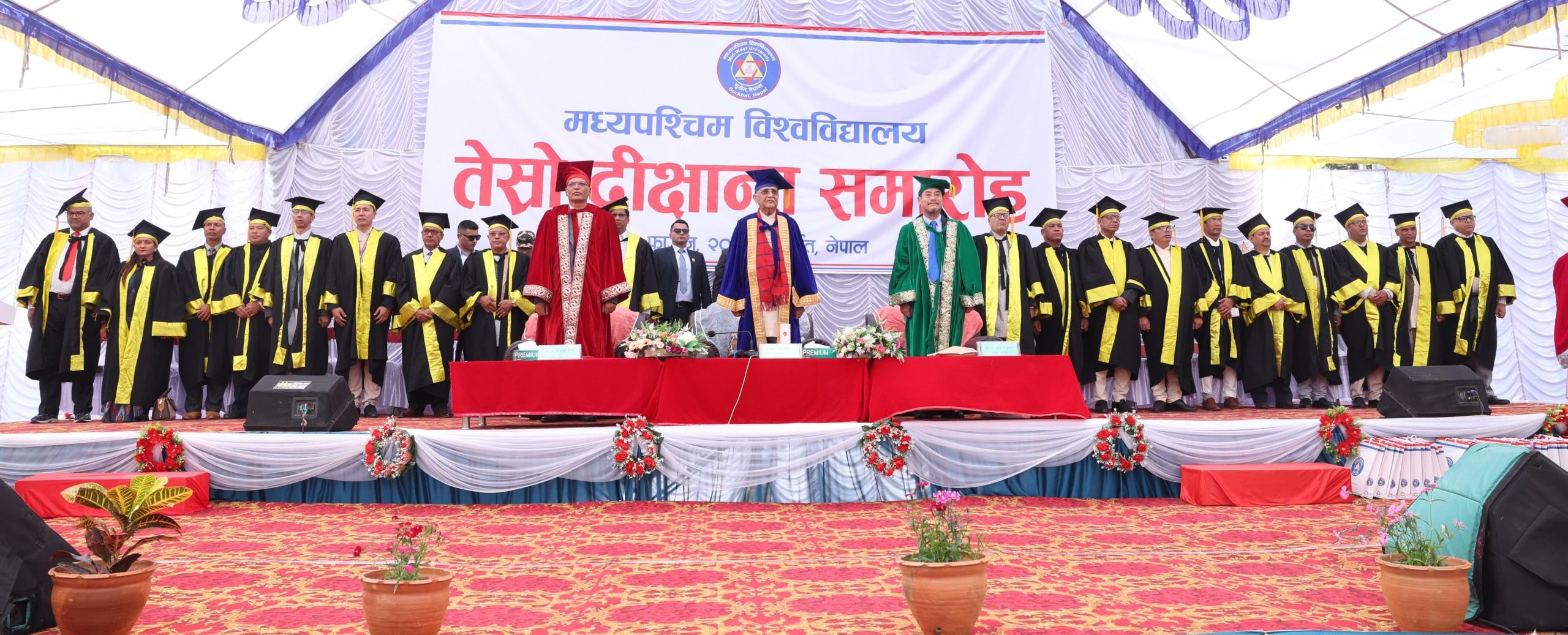 सुर्खेत । प्रधानमन्त्री एवं कुलपति केपी शर्मा ओलीबाट मध्यपश्चिम विश्वविद्यालयको तेस्रो दीक्षान्त समारोहका अवसरमा आज विभिन्न तह र संकायका तीन हजार आठ सय ४१ विद्यार्थी दीक्षित भएका छन् ।