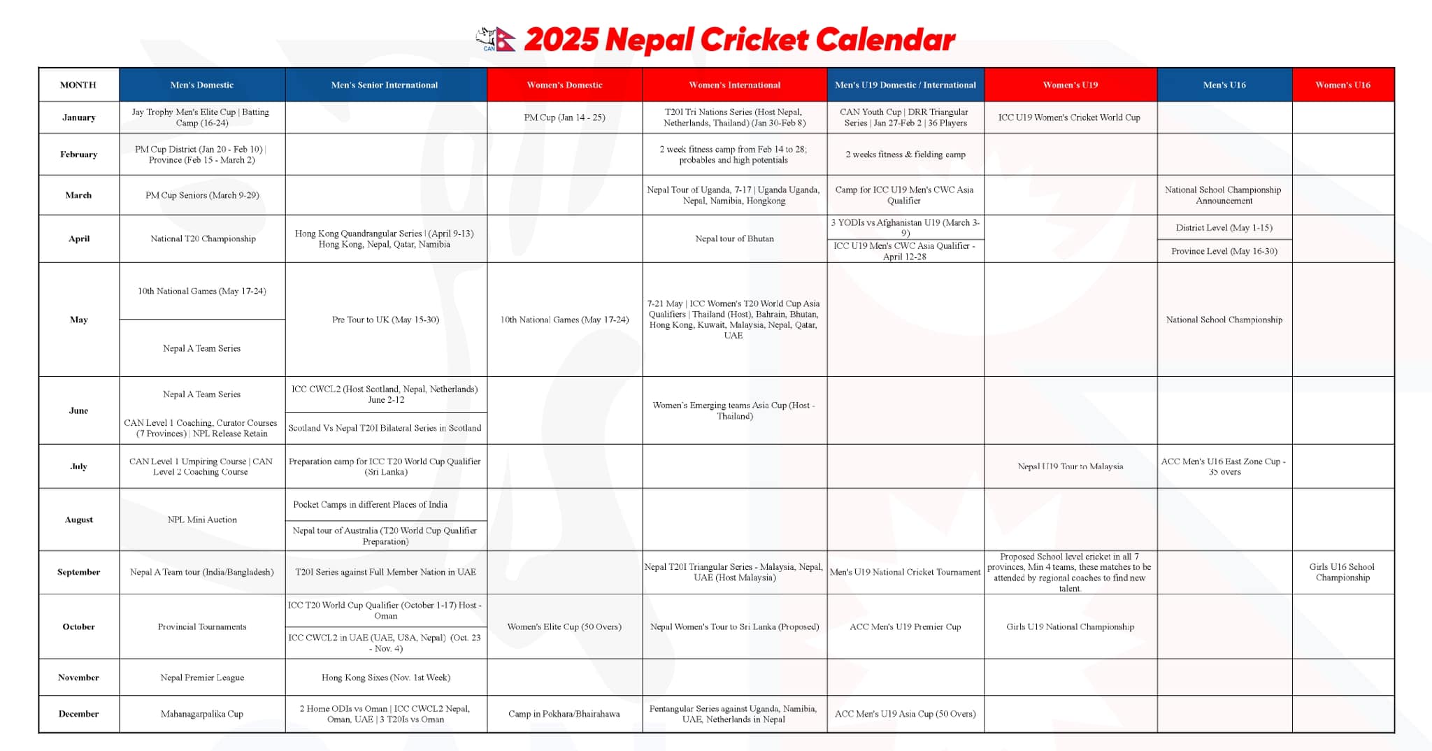 यस्तै, मेन्स सिनियरको लागि मे महिनामा ‘प्री–टुर टु यूके’ भनेर समावेश गरिएको छ । यस्तै, विश्वकपका लागि जुलाईमा श्रीलङ्कामा प्रशिक्षण क्याम्प हुनेछ ।