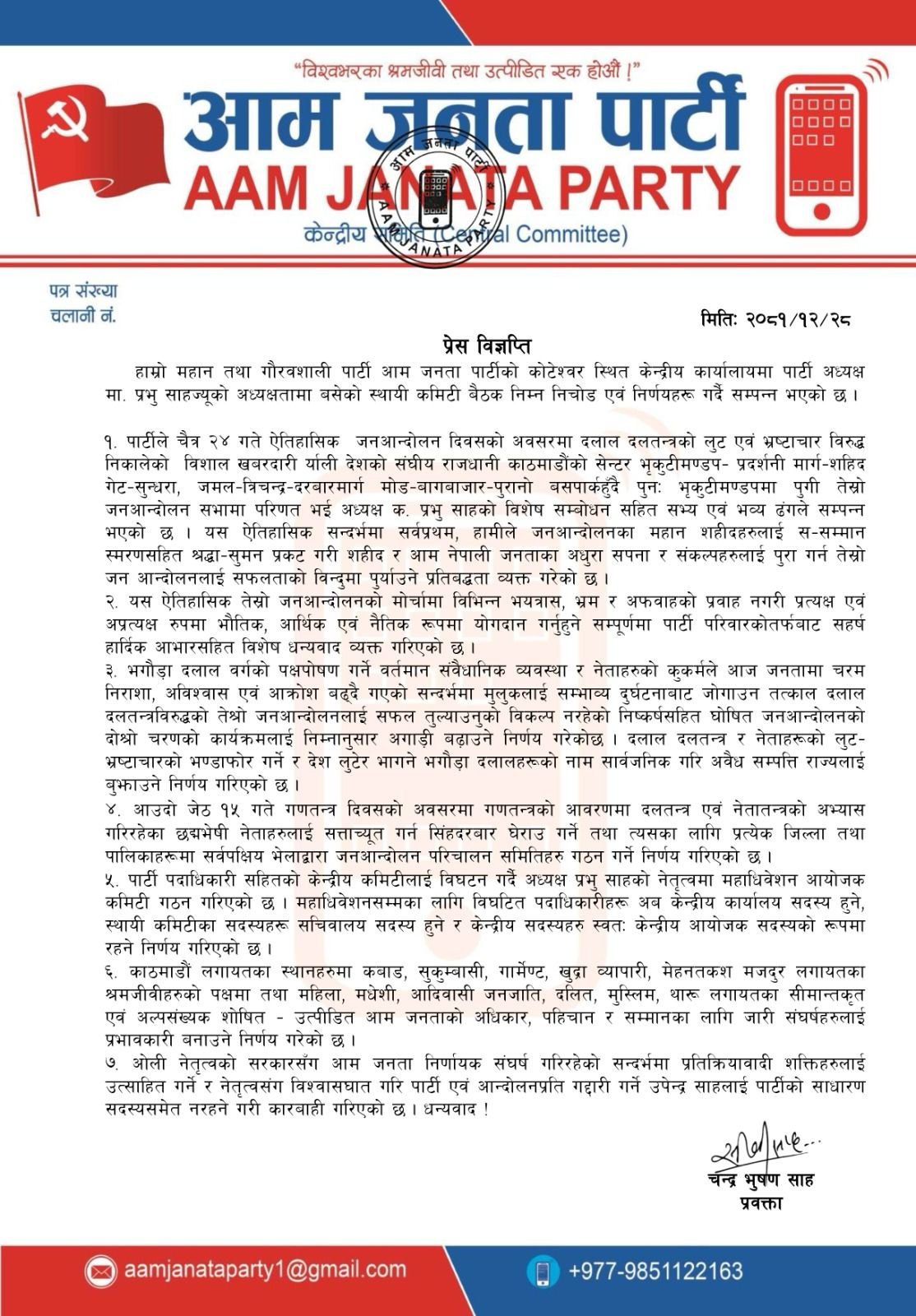 ‘आउदो जेठ १५ गते गणतन्त्र दिवसको अवसरमा गणतन्त्रको आवरणमा दलतन्त्र एवं नेतातन्त्रको अभ्यास गरिरहेका नेताहरुलाई सत्ताच्यूत गर्न सिंहदरबार घेराउ गर्ने तथा त्यसका लागि प्रत्येक जिल्ला तथा पालिकाहरूमा सर्वपक्षिय भेलाद्वारा जनआन्दोलन परिचालन समितिहरु गठन गर्ने निर्णय गरिएको छ,’ आजपाले जारी गरेको बिज्ञप्तीमा भनिएको छ ।