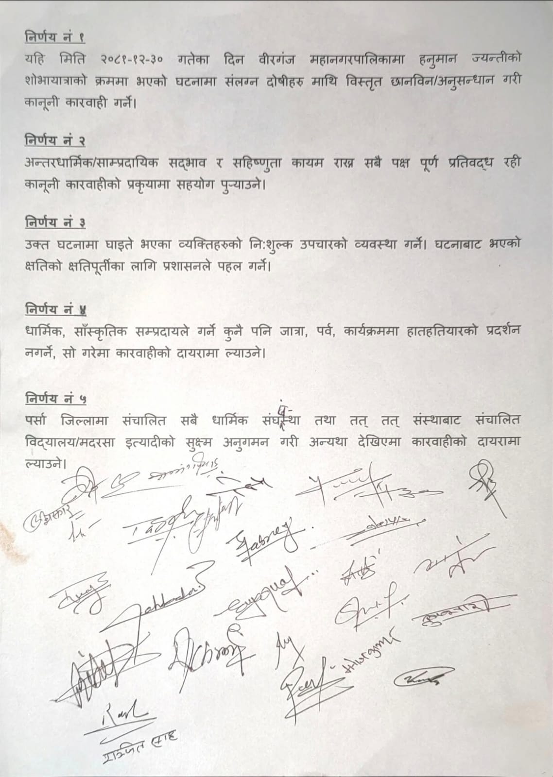 बैठकले मुख्य रूपमा पाँचवटा विषयमा सहमति गरेको छ । जसमा हनुमान जयन्तीको शोभायात्रामा भएको घटनामा संलग्न दोषीहरूको पहिचान गरी कानूनी प्रक्रियाअनुसार आवश्यक कारबाही गर्ने, सद्भाव र सहिष्णुता कायमः बैठकमा सहभागी सबै पक्षले आपसी धार्मिक र साम्प्रदायिक सद्भाव कायम राख्ने प्रतिवद्धता व्यक्त गरेका छन् ।