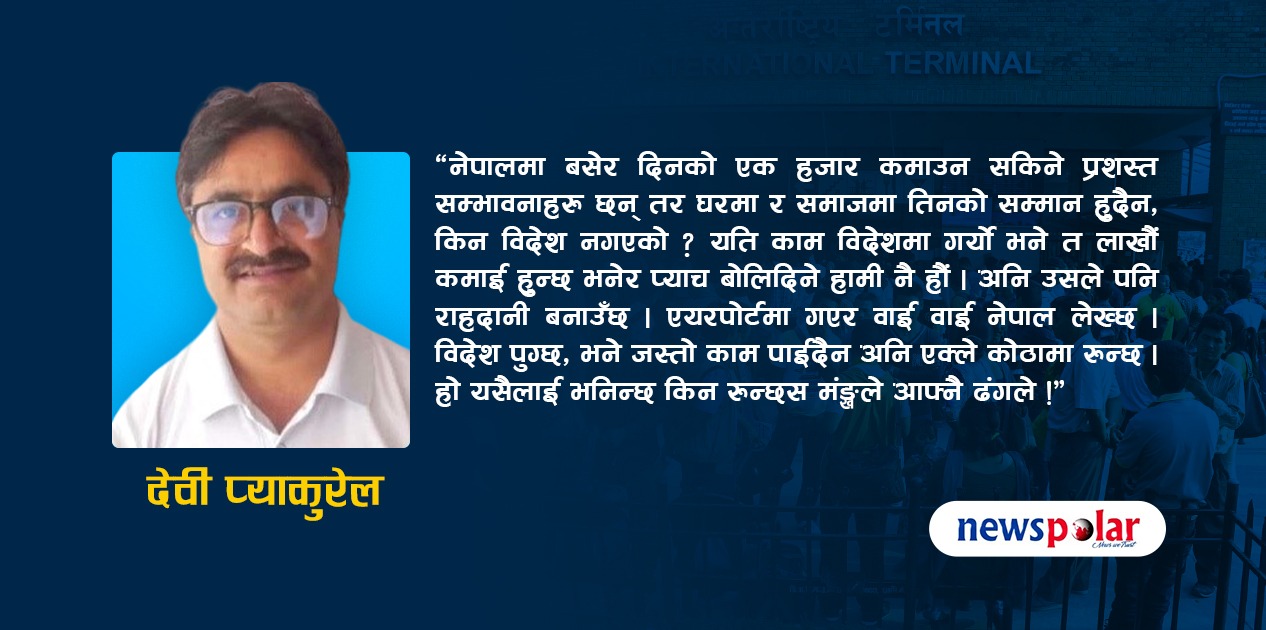 बेला बखतमा हाम्रा युवा नेताजीले किर्तिपुरको मात्र हैन नेपालका सबैडाडाँमा बसेर पैसा कमाउन सकिन्छ भन्दै गर्दा एक घण्टा बिजुली वत्ति गए सबै ईन्टरनेट सेवा बन्द हुने यँहि नेपालको कर्णाली प्रदेशको, नलगाड नगरपालिकाको खान्टाकुरडाडाँमा आएर फेरि त्यो वाक्य सुन्न मन लागेको छ । हो यस्ता डाडाँकाँडा नेपालै भरि छन् । लाखौ पैसा खर्च गरेर प्राविधक ज्ञान सीप हासिल गरेका युवालाई नेपाल फर्काउन कसले सक्ला र खै ?खान्टाकुरा डाँडाकै आसपासमा एक युवाले किवी खेती गर्न रु २ लाख लगानि गरेका छन् तर सिंंचाईको लागि पानि जम्मा गर्ने पोखरी निमार्ण गर्नको लागि कुनै तहको सरकारसंग बजेट छैन । अनि हाम्रा गफमा,भाषणमा हामी युवालाई देशमै रोजगारी दिन्छौ भन्न छाडेका छैनौं तर हाम्रो नीति, योजना र बजेट भने काम कुरो एकातिर कुम्लो बोकी ठिमी तिर जस्तो भईरहेको देखिन्छ । अनि गाउँमा बिरामी पर्दा बोकेर लैजाने मान्छे छैनन् । यस्तो अवस्था सिर्जित गर्ने हामी आफै होइनौं र ?हो यसैलाई भनिन्छ किन रुन्छस मंङ्खले आफ्नै ढंगले ।
