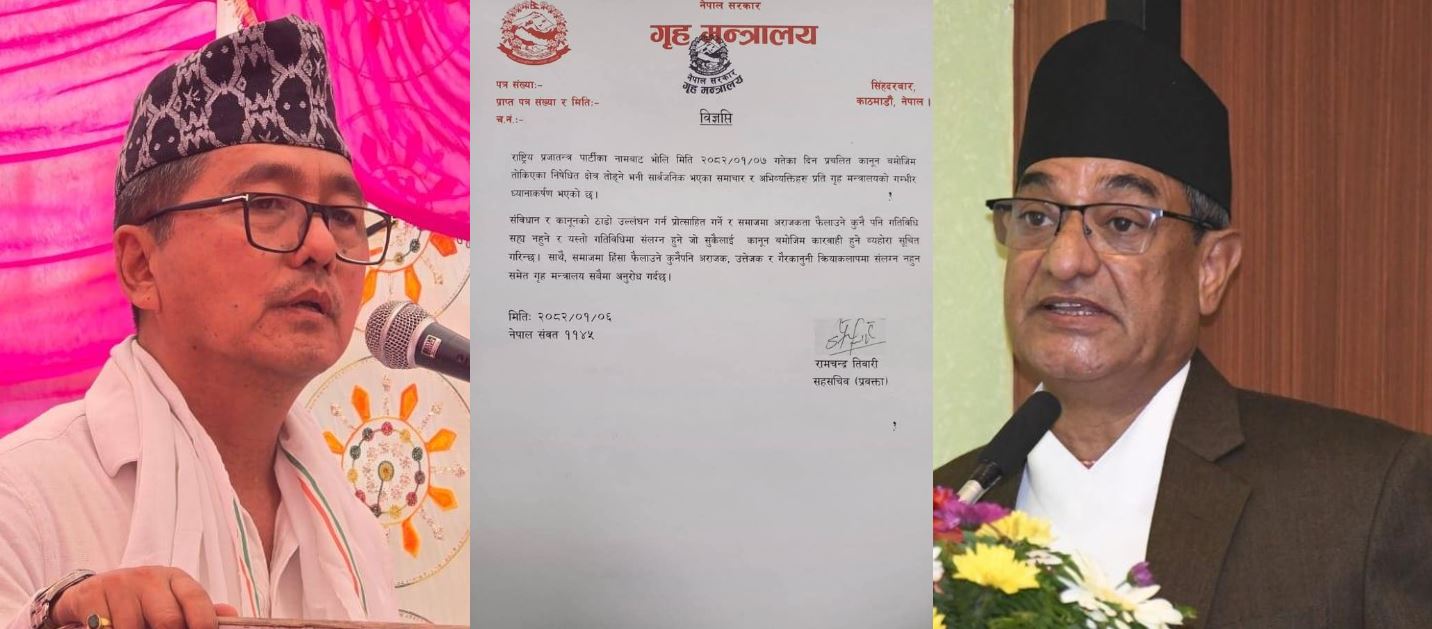 ’यस्तो गतिविधिमा संलग्न हुने जोसुकैलाई कानुन बमोजिम कारबाही हुने ब्योहरा सूचित गरिन्छ। साथै समाजमा हिंसा फैलाउने कुनै पनि अराजक, उत्तेजक र गैरकानुनी क्रियाकलापमा संलग्न नहुन समेत गृह मन्त्रालय सबैमा अनुरोध गर्दछ,’ विज्ञप्तिमा भनिएको छ ।