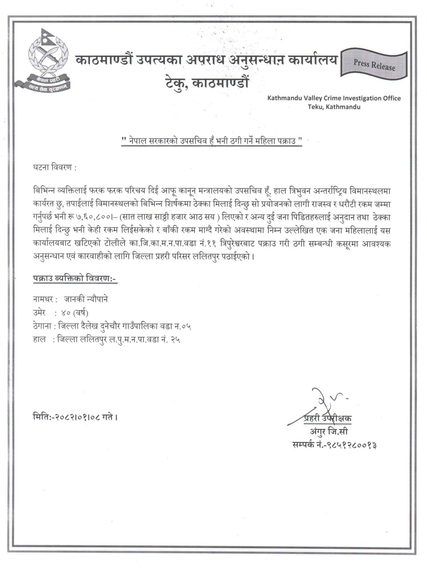 काठमाडौँ। प्रहरीले विभिन्न व्यक्तिलाई फरक–फरक परिचय दिइ ठगी गर्ने ४० वर्षीया जानकी न्यौपानेलाई पक्राउ गरेको छ ।