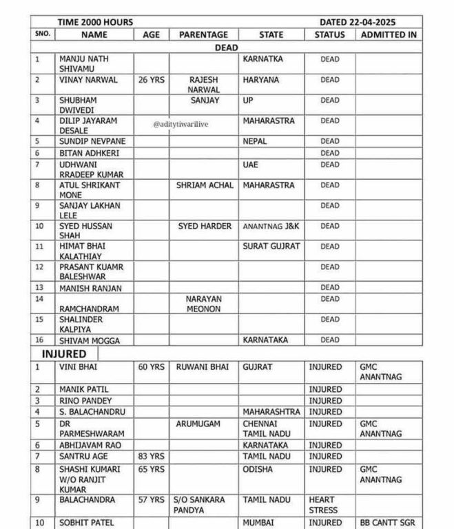 सुरक्षा अधिकारीहरूलाई उद्धृत गर्दै मृतकमध्ये १६ जनाको नाम सञ्चारमाध्यमले सार्वजनिक गरेका छन् । त्यसमा एक नेपाली भनेर सन्दीप न्यौपानेको नाम उल्लेख छ तर विस्तृत विवरण छैन । घटनालगत्तै गृहमन्त्री अमित शाह कश्मीर पुगेका छन् ।