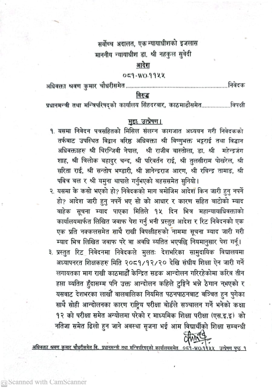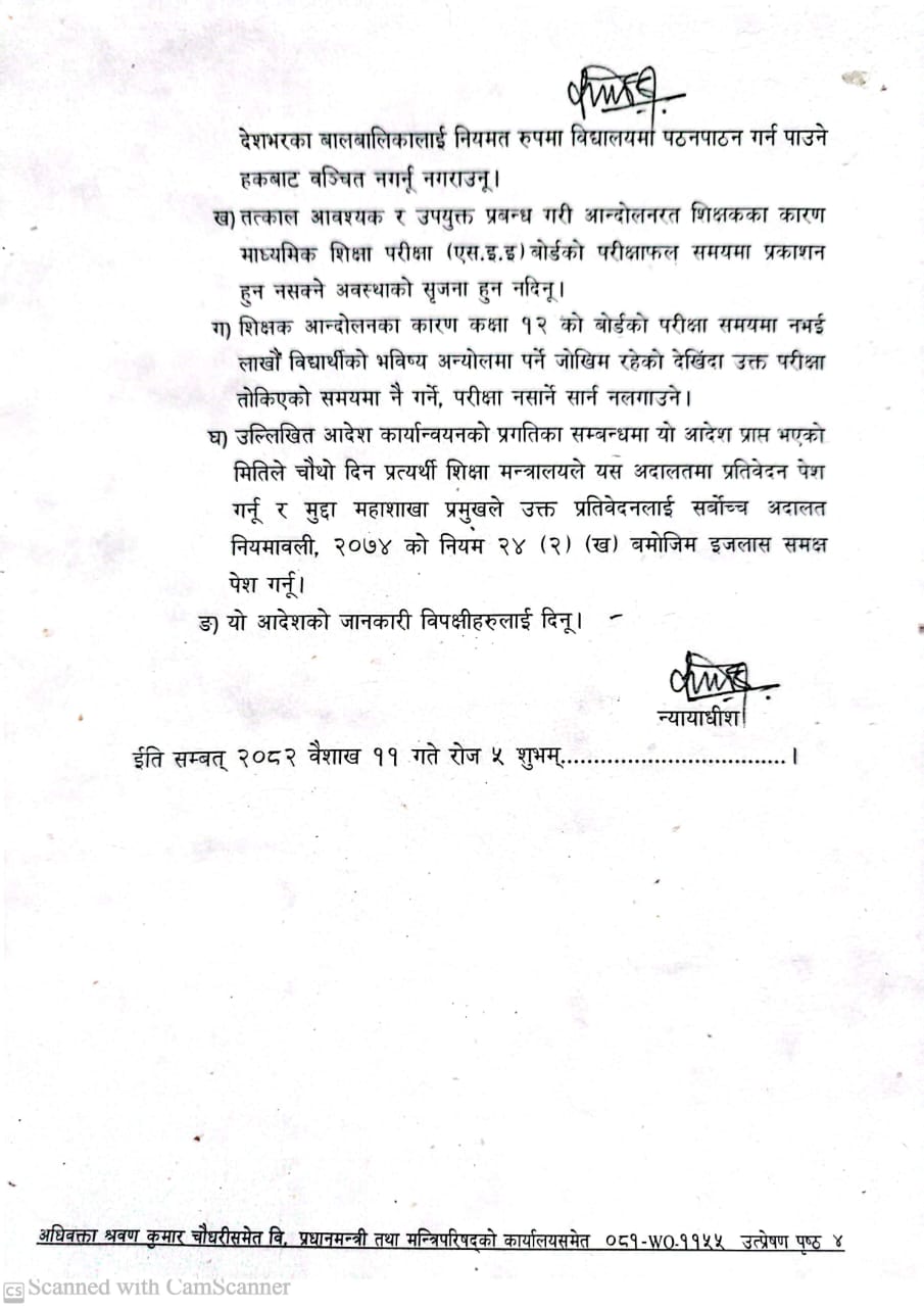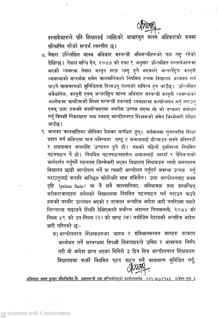 अधिवक्ता श्रवणकुमार चौधरीले दायर गरेको रिटमा सुनुवाइ गर्दै न्यायाधीश नहकुल सुवेदीको इजलासले आन्दोलनरत शिक्षकहरुका जायज र संविधानसम्मत मागहरु तत्काल सम्बोधन गर्ने सम्बन्धमा विपक्षी निकायहरुले उचित र आवश्यक निर्णय गरी यो आदेश प्राप्त भएका मितिले ३ दिनभित्र आन्दोलनरत शिक्षकहरू विद्यालयमा फर्की नियमित पठन पाठन गर्ने वातावरण सुनिश्चित गर्नू भनि आदेश दिएको छ ।