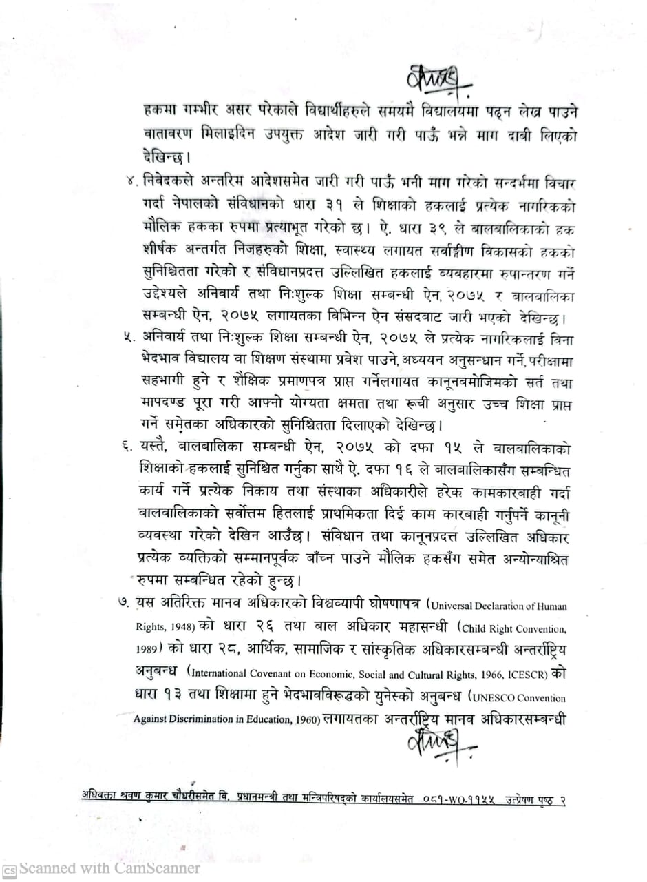 सर्वोच्चले ३ दिनभित्र निर्देश कार्यान्वयन गरेर त्यसको प्रगति आदेश प्राप्त भएको मितिले चौथो दिनमा प्रतिवेदन पेस गर्न शिक्षा मन्त्रालयलाई आदेश गरेको छ।
