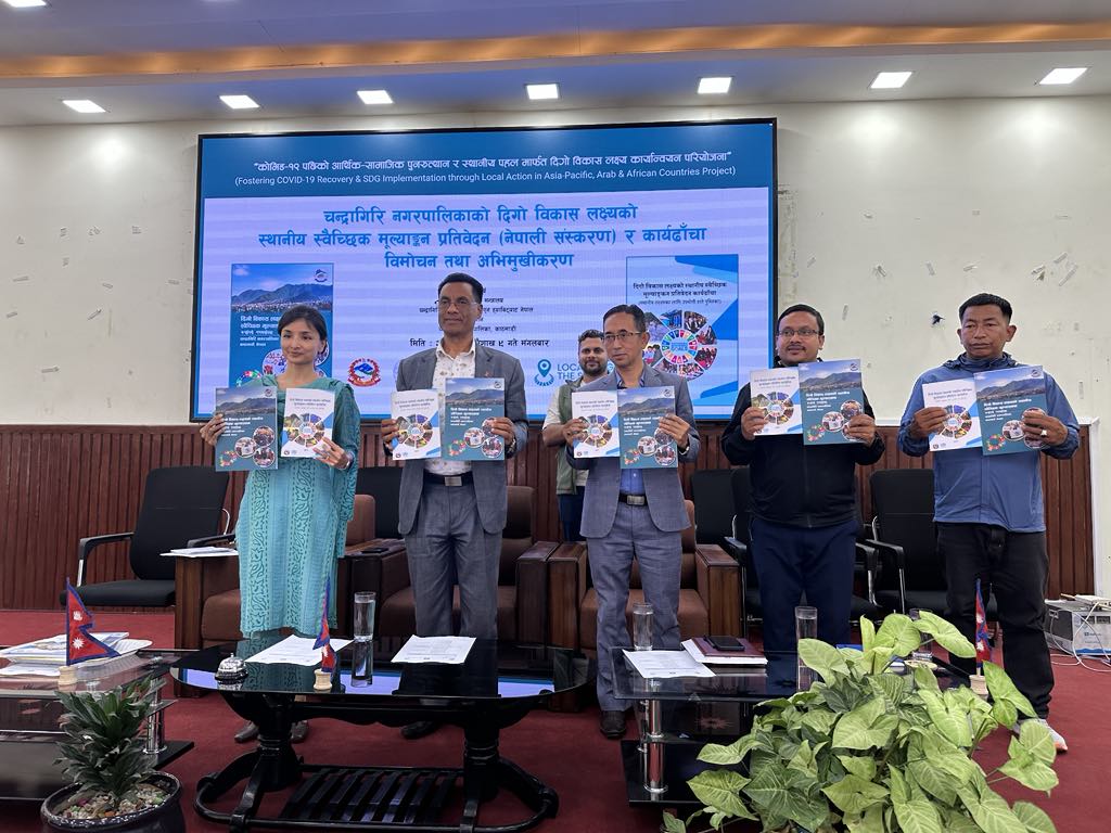 नगरपालिकाको सभाकक्षमा हालै आयोजित कार्यक्रममा चन्द्रागिरि नगरपालिका प्रमुख घनश्याम गिरी, प्रमुख प्रशासकीय अधिकृत सुरेन्द्र थापा मगर, युएन ह्याविट्याटका प्रतिनिधि प्रज्ञा प्रधान लगायतले ‘दिगो विकास लक्ष्यको स्थानीय स्वैच्छिक मूल्याङ्कन प्रतिवेदन’ (नेपाली संस्करण) र कार्ययोजना ढाँचा सार्वजनिक गर्नुभयो ।