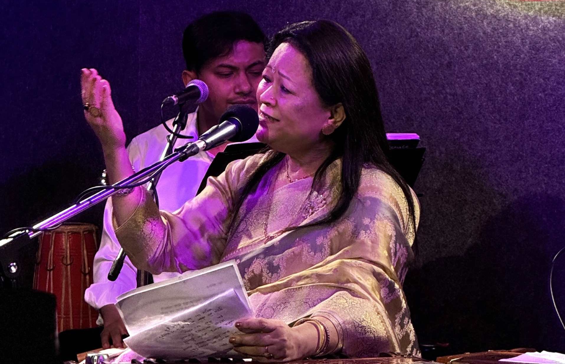 कार्यक्रमको शुरुवात खयाल गायनबाट भएको थियो । राग ‘रागेश्री‘को विलम्वित लयमा सङ्गीता आफैँले सृजना गरेको बन्दिस (गीत) ‘सब सुख दियौ‘ प्रस्तुत भएको थियो । एकतालबाट शुरु भएको रागले मध्यलय प्रवेश गर्दा दर्शक, श्रोता रोमाञ्चक बनेको अनुभूति हुन्थ्यो । तीनतालमा रहेको मध्यलयको बन्दिस ‘उनि उनि रहिछौ किन हो सङ्गिनी‘ कविवर माधव घिमिरेको शब्द सृजना थियो ।