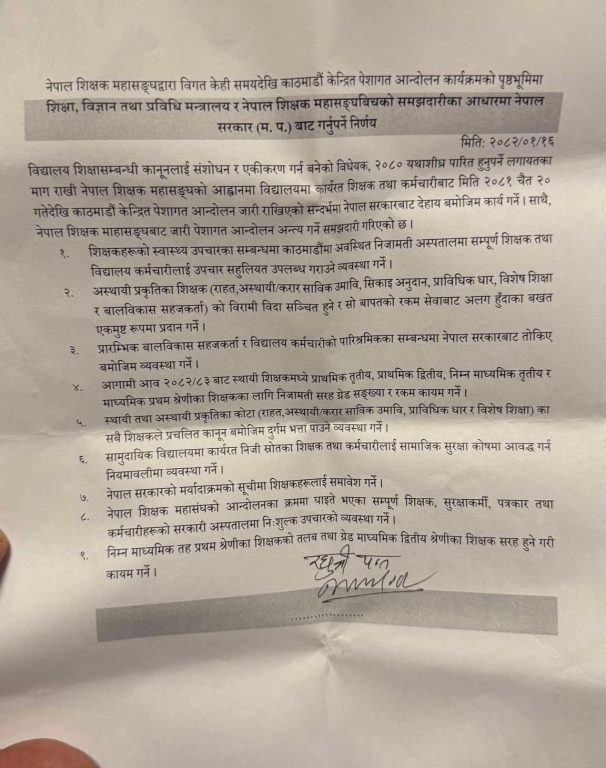 काठमाडौं । सरकार र आन्दोलनरत शिक्षकबीच ९ बुँदे सहमति भएको छ । योसँगै शैक्षिक हड्तालसहित काठमाडौं केन्द्रित सडक आन्दोलन गर्दै आएका शिक्षकको २९ औं दिनपछि आन्दोलन स्थगित भएको छ । शिक्षकहरु विद्यालय फर्कन तयार भएका छन् । भोलिदेखि नै विद्यालय खुल्ने भएका छन् ।