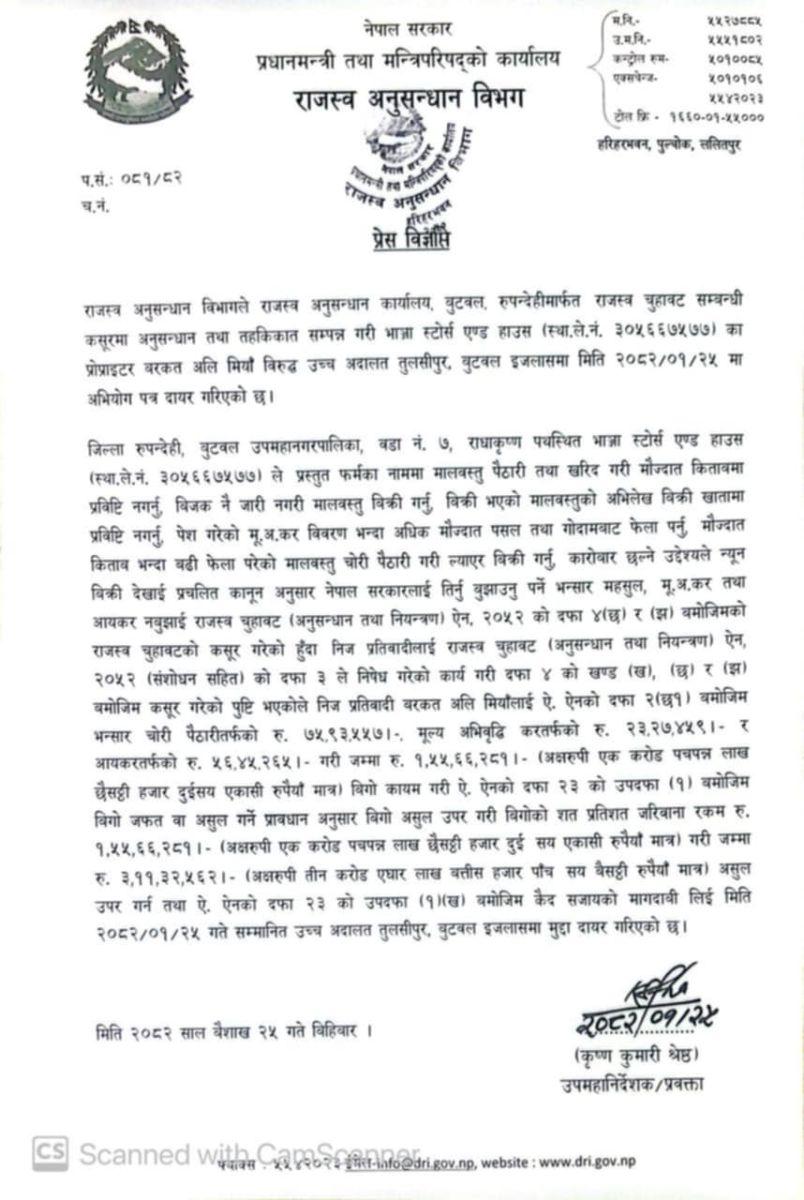 बुटवल उपमहानगरपालिका–६ राधाकृष्णपथस्थित ‘भाञ्जा स्टोर्स एण्ड हाउस’का सञ्चालक बरकत अलि मियाँमाथि तीन करोड ११ लाख ३२ हजार रुपैयाँ बराबरको राजस्व चुहावटको आरोप लागिएको छ। आन्तरिक राजश्व कार्यालयका प्रमुख राजश्व अधिकृत विवेक घिमिरेका अनुसार, मियाँले एक करोड ५५ लाख ६६ हजार २८१ रुपैयाँ बराबरको राजस्व छली गरेका थिए। सोही बराबरको जरिवाना सहित उच्च अदालत तुलसीपुर, बुटवल इजलासमा बिहीबार मियाँविरुद्ध मुद्दा दायर गरिएको हो।