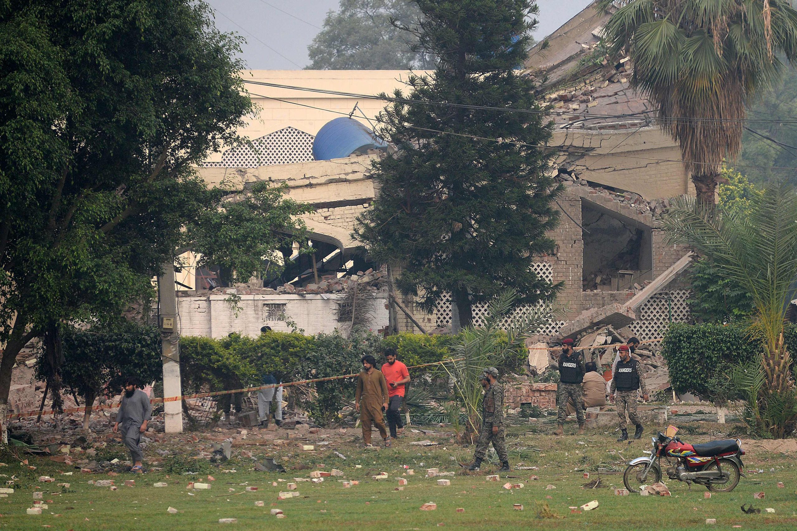 Paramilitary soldiers inspect a collapsed building of the Government Health and Educational complex after Indian strikes in Muridke, about 30 kilometres from Lahore, on May 7, 2025. India fired missiles at Pakistani territory early on May 7, killing at least eight people, according to Pakistan, which said it had begun retaliating in a major escalation between the nuclear-armed rivals. (Photo by Murtaz Ali / AFP)