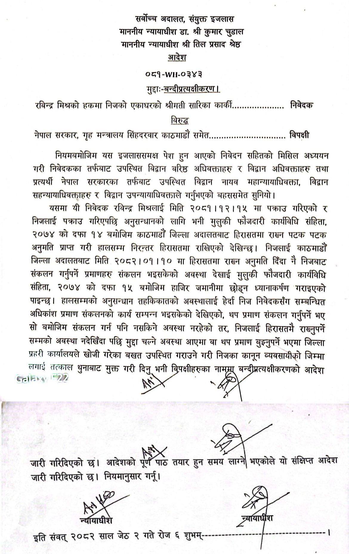 मिश्रलाई गैरकानुनी थुनामा राखेको भन्दै उहाँकी श्रीमती सारिका कार्कीले सर्वोच्चमा बन्दीप्रत्यक्षीकरणको रिट दायर गर्नुभएको थियो ।