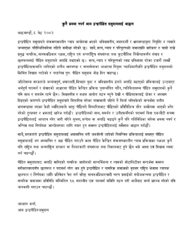 द्वन्द्वपीडित समुदायका तर्फबाट जारी गरिएको विज्ञप्तिमा भनिएको छ– ‘जहिलेसम्म सरकारले अन्यायपूर्ण, अपारदर्शी, मिचाहा युक्त र अविश्वसनीय ढंगले अगाडि बढाएको प्रक्रियालाई उल्ट्याएर अर्थपूर्ण परामर्श र संवादको आधारमा पीडित केन्द्रित प्रक्रिया पुनस्र्थापित गर्दैन, त्यतिबेलासम्म पीडित समुदायको कुनै पनि साथ र समर्थन रहने छैन,’ विज्ञप्तिमा अगाडि भनिएको छ– ‘विश्वसनीय र सक्षम आयोग गठन नहुनेदेखि र पीडितहरूलाई धोका र अपमान दिइएको कारणले द्वन्द्वपीडित समुदायले सिफारिस गरेका नामावाली पहिले नै फिर्ता गरिसकेको सन्दर्भमा दलीय भागवण्डामा गएका केही व्यक्तिहरूले आफू पीडितले सिफारिसबाट पीडितको प्रतिनिधित्व गरेर आयोगमा आएको भनेर गरेको दुस्प्रचार र भ्रमलाई खारेज गर्दछौं। द्वन्द्वपीडितको साथ, समर्थन र उनीहरूसँगको परामर्श बिना एकलौटी रूपमा द्वन्द्वपीडितलाई आव्हान गरेर जारी गरिने सूचना, सन्देश वा अगाडि बढाइने कुनै पनि गतिविधिका बारेमा भ्रममा नपर्न र अन्तिम तथा निर्णायक आन्दोलनका लागि तयार हुन समस्त द्वन्द्वपीडितलाई यसैसाथ आह्वान गर्दछौँ ।’