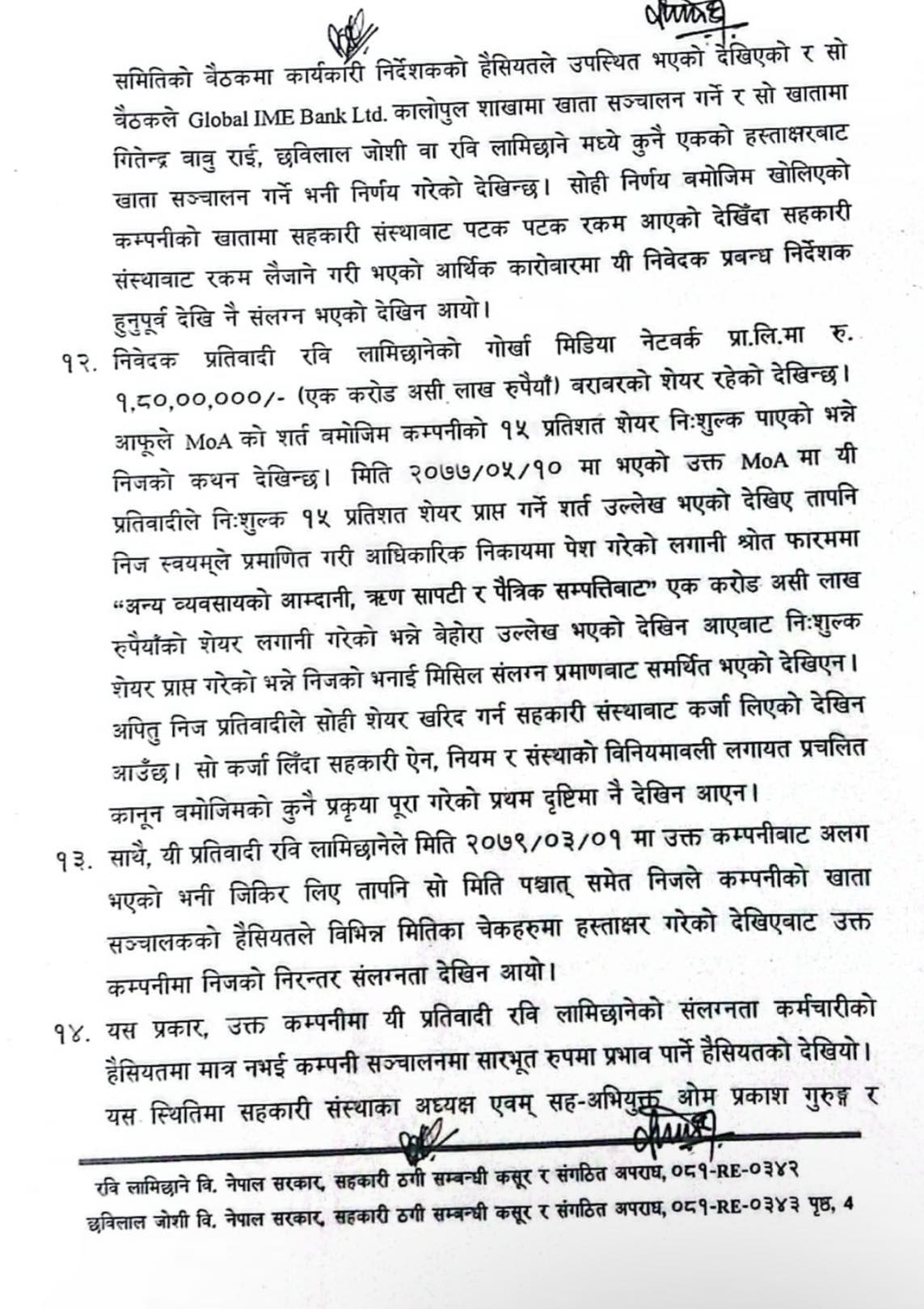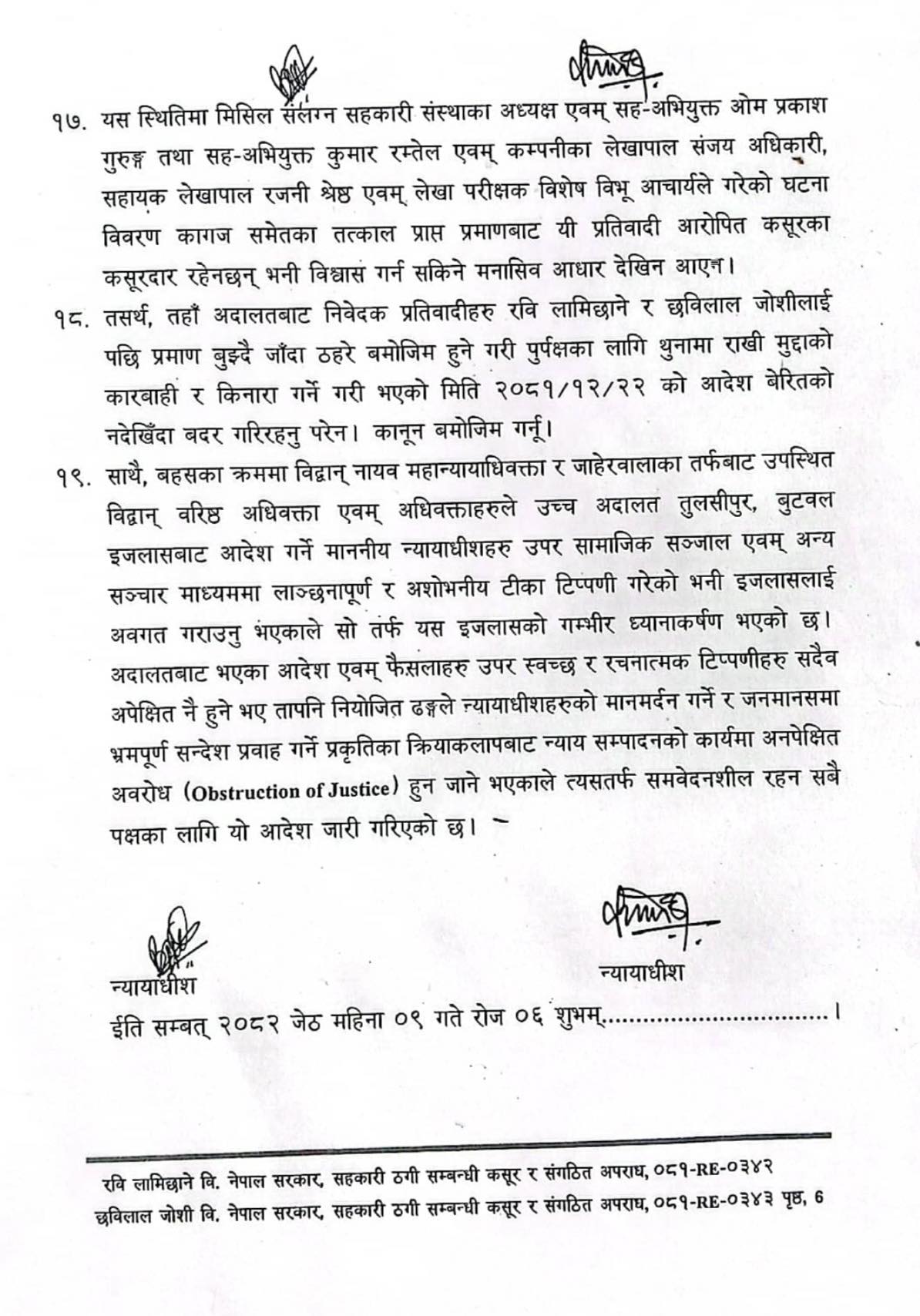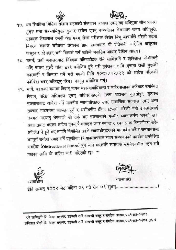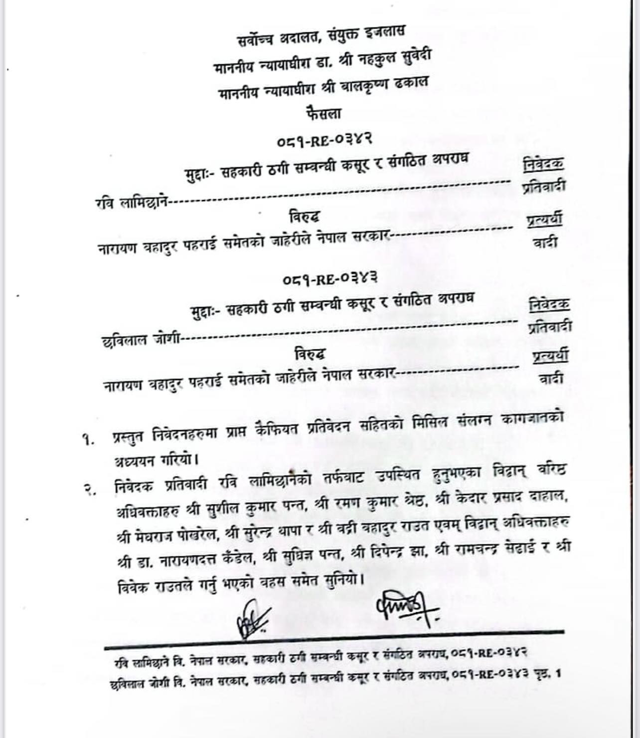 न्यायाधीशहरू डा. नहकुल सुवेदी र बालकृष्ण ढकालको इजलासले लामिछानेलाई थुनामुक्त गर्नुपर्ने माग राखी गत वैशाख ७ गते लामिछानेका तर्फबाट पत्नी निकिता पौडेलले दिएको दायर बन्दीप्रत्यक्षीकरणको निवेदन खारेज गरेको हो ।