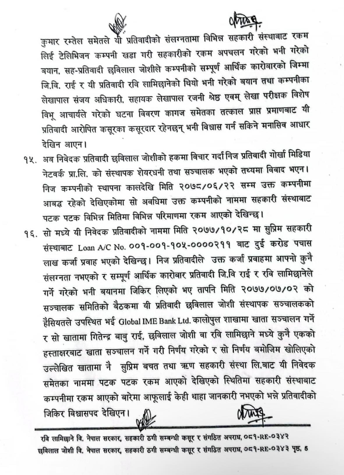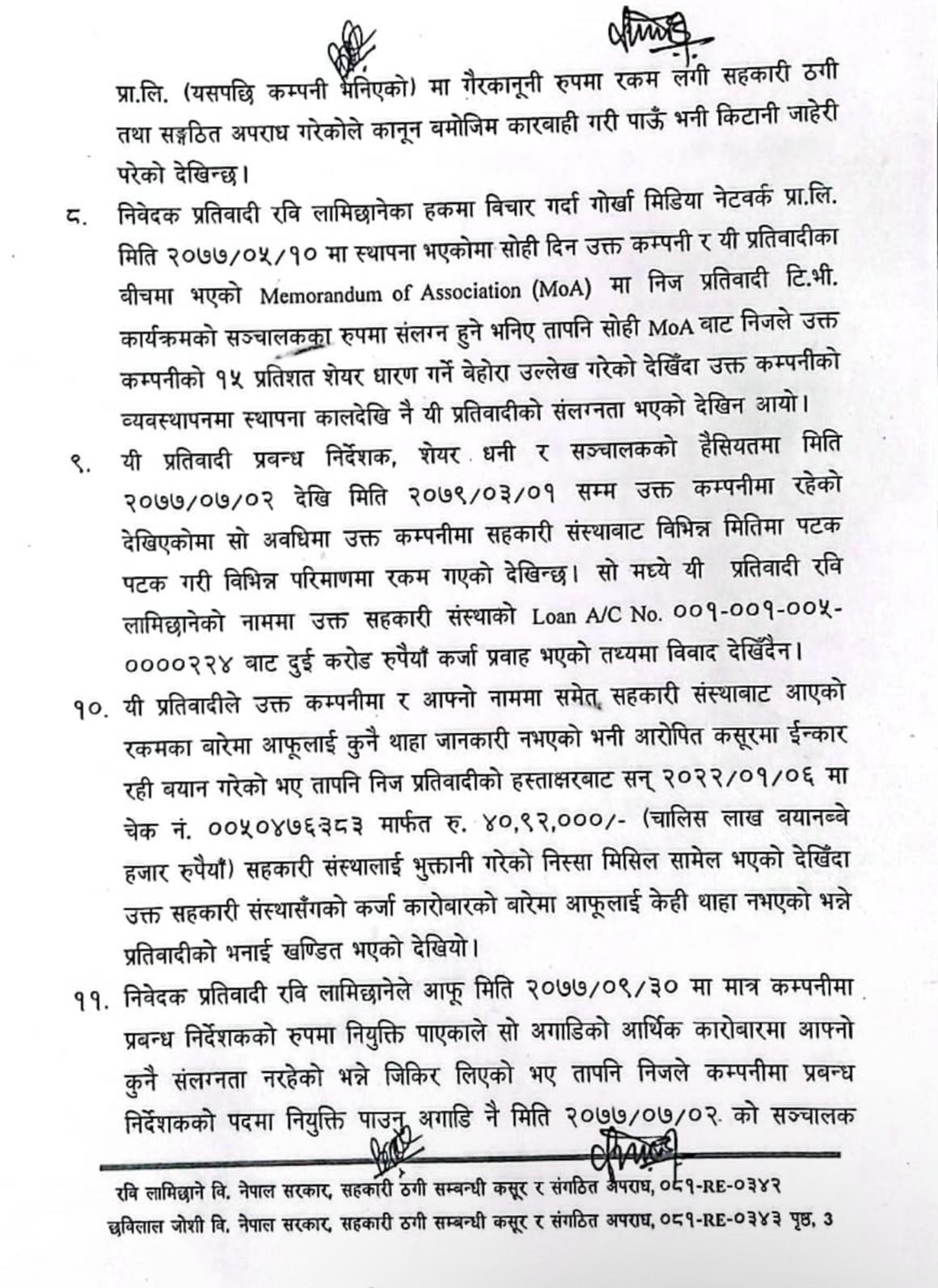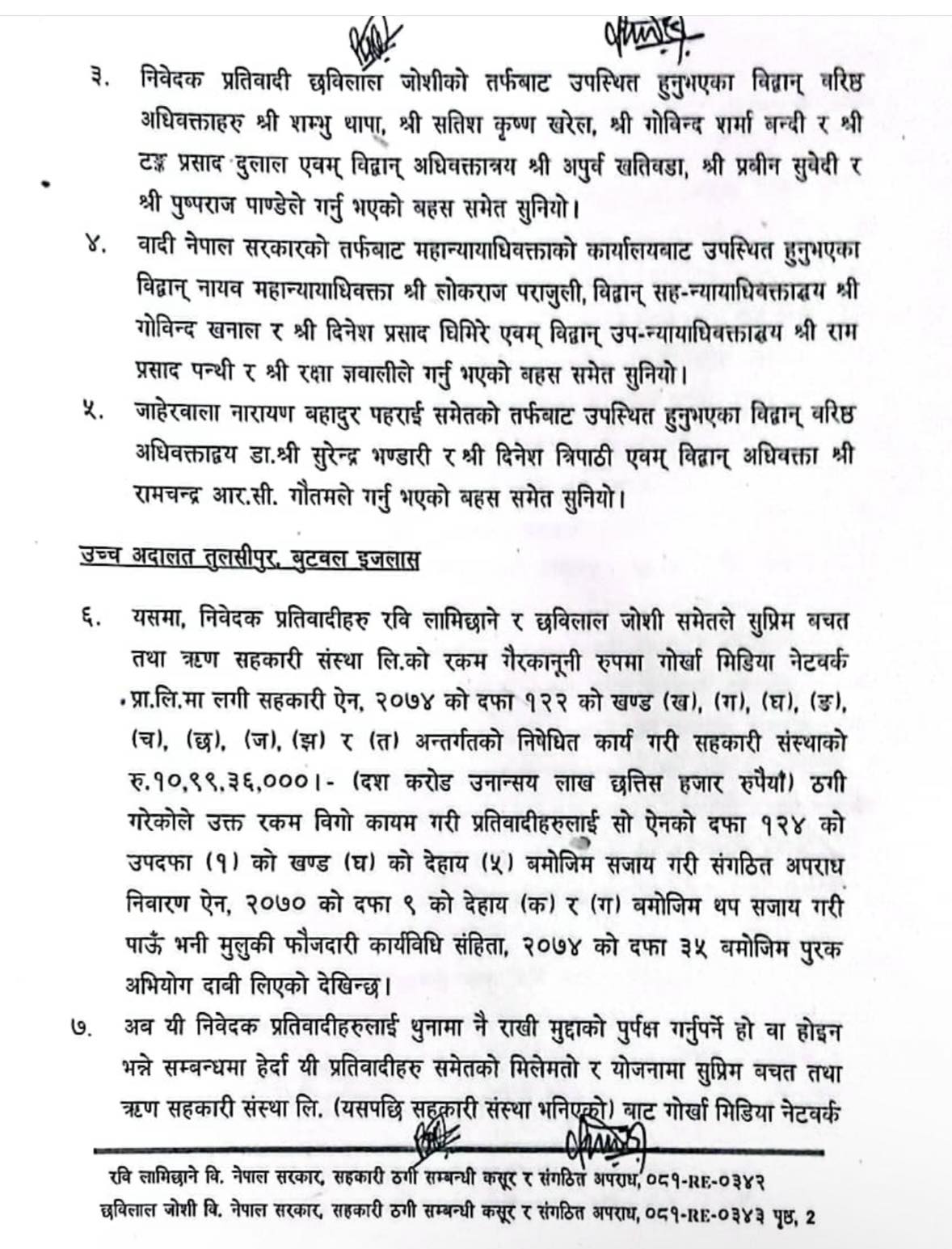 काठमाडौं। सर्वोच्च अदालतले सहकारी प्रकरणमा जोडिएका राष्ट्रिय स्वतन्त्र पार्टीका सभापति एवं पूर्वगृहमन्त्री रवि लामिछानेलाई थुनामा पठाउने उच्च अदालतको बुटवल इजलासको आदेशलाई सदर गरेको छ ।