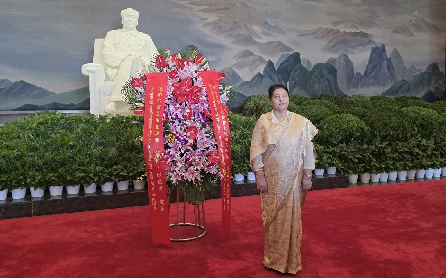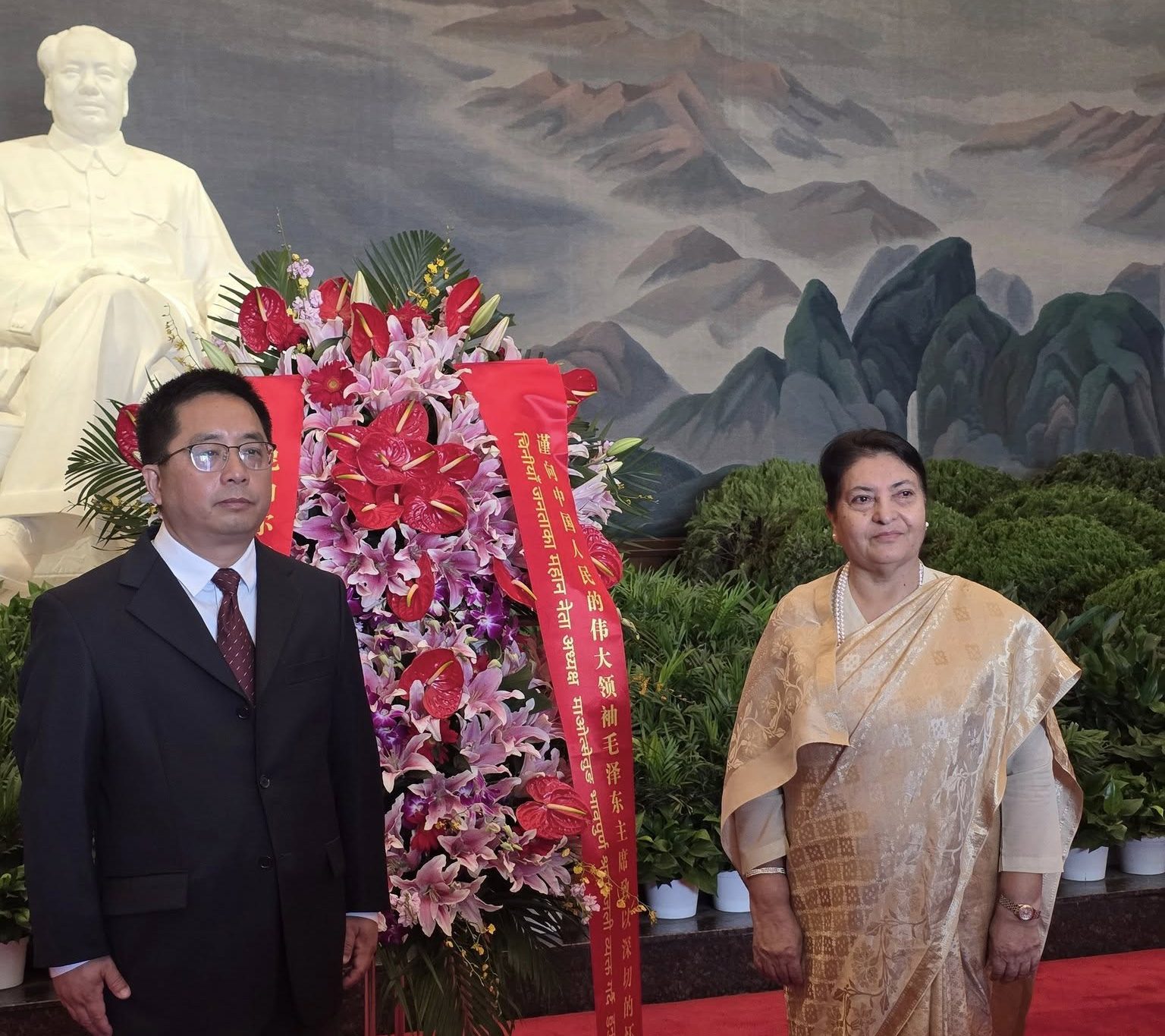 काठमाडौं । चीन भ्रमणमा रहनु भएका पूर्वराष्ट्रपति विद्यादेवी भण्डारीले आज चीनको राजधानी बेइजिङस्थित तियानमेन स्क्वायरमा रहेको चिनियाँ कम्युनिष्ट पार्टीका नेता स्वर्गीय माओत्सेतुङको समाधिस्थलमा पुष्पाहार अर्पण गरी श्रद्धाञ्जली व्यक्त गर्नुभएको छ ।