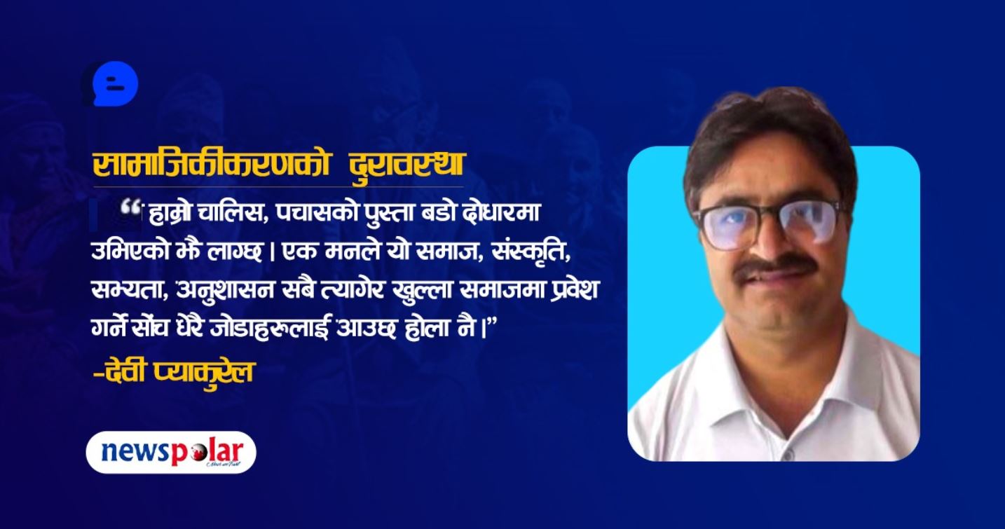 सामाजिकीकरणको यो दुरावस्था छ कि समाज पुरै एक अर्काको विपरित छन । एक पुस्ताबाट अर्को पुस्ता बिचको दुरी बढीरहेको छ । जेष्ठ नागरिकहरुका ज्ञान,सीप लाई सम्मान गर्ने परिपाटि पनि हामीले नै ल्याउनु छ अर्को तेश्रो पुस्तालाई जोगाएर हुर्काउनु पनि हामीले नै छ । अहिले हाम्रो चालिस, पचासको पुस्ता बडो दोधारमा उभिएको झै लाग्छ । एक मनले यो समाज, संस्कृति, सभ्यता, अनुशासन सबै त्यागेर खुल्ला समाजमा प्रवेश गर्ने सोंच धेरै जोडाहरुलाई आउछ होला नै ।