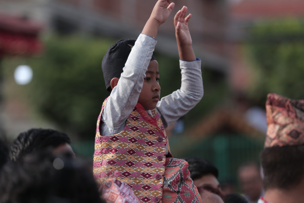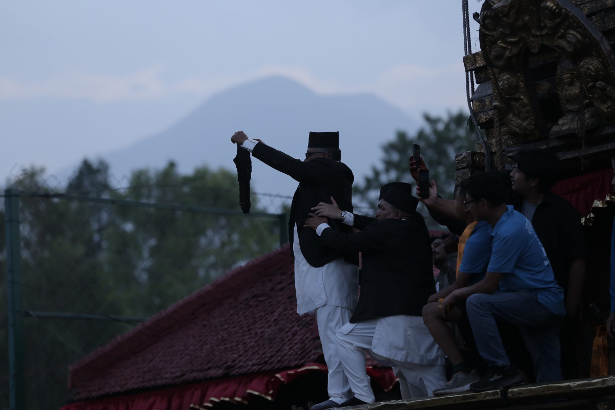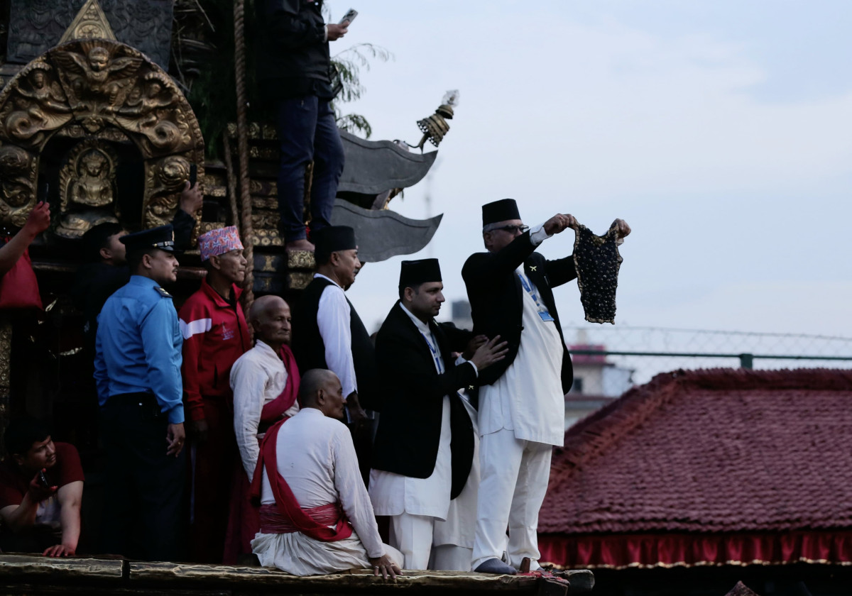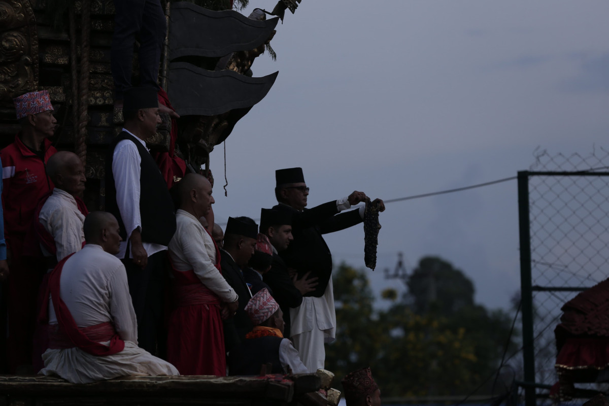 गुठी संस्थान ललितपुरका प्रतिनिधिले मत्स्येन्द्रनाथको रथमा उभिएर भोटो देखाउनु भयो ।