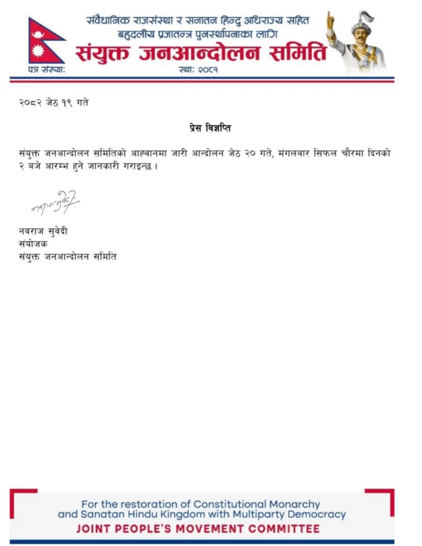 राजसंस्था र हिन्दू राष्ट्र पुन:स्थापनाको माग गर्दै नवराज सुवेदी नेतृत्वको समितिले आज दिउँसो २ बजे आन्दोलन सुरु हुने जनाएको छ ।
