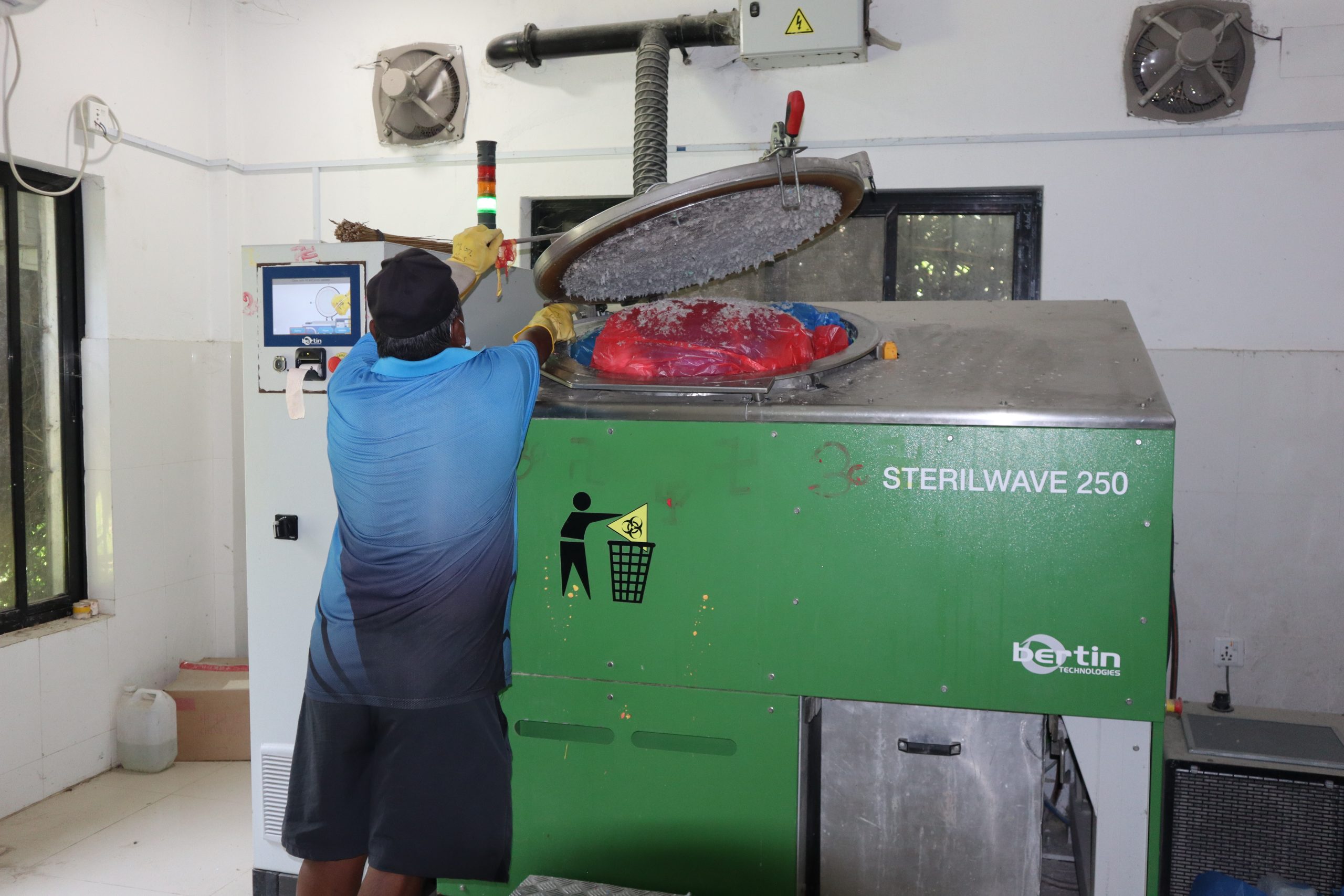 माइक्रोवेभ टेक्नोलोजीसहितको स्रेडिङ मेसिन अस्पतालको बायोमेडिकल फोहर प्रशोधन गर्ने मुख्य उपकरण हो । अस्पतालबाट निस्कने सिसा, धारिलो वस्तु ९निडल, सर्जिकल ब्लेड०, कपडाका टुक्रा र प्लास्टिकजस्ता सबै प्रकारका फोहर मिसाएर राख्न सकिन्छ । यो मेसिनको क्षमता दुई सय ५० लिटर रहेको उहाँले जानकारी दिनुभयो । मिश्रले भन्नुभयो, “यसले करिब ३० मिनेटमा फोहरलाई प्रशोधन गर्छ । मेसिनभित्र रहेको स्रेडर ब्लेडले फोहरलाई सानो टुक्रा बनाउँछ र सँगै रहेको इन्टिग्रेटेड माइक्रोवेभ टेक्नोलोजीले यसलाई स्टेरिलाइज (निसङ्क्रमण) गर्छ ।”
